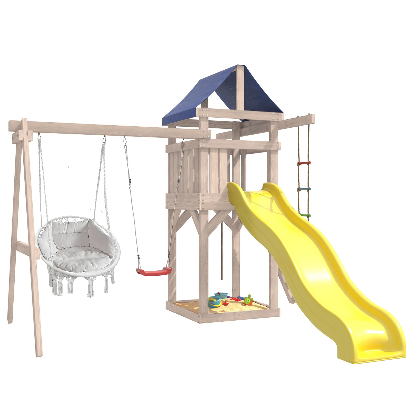 Детская площадка IgroWoods - отличное решение для активного отдыха детей на свежем воздухе. Она представляет собой многофункциональный игровой комплекс, который включает в себя горку, качели, песочницу, игровую веранду, веревочную лестницу, скалодром и канат. Все элементы выполнены из качественных и безопасных материалов, что обеспечивает долговечность и надежность конструкции.