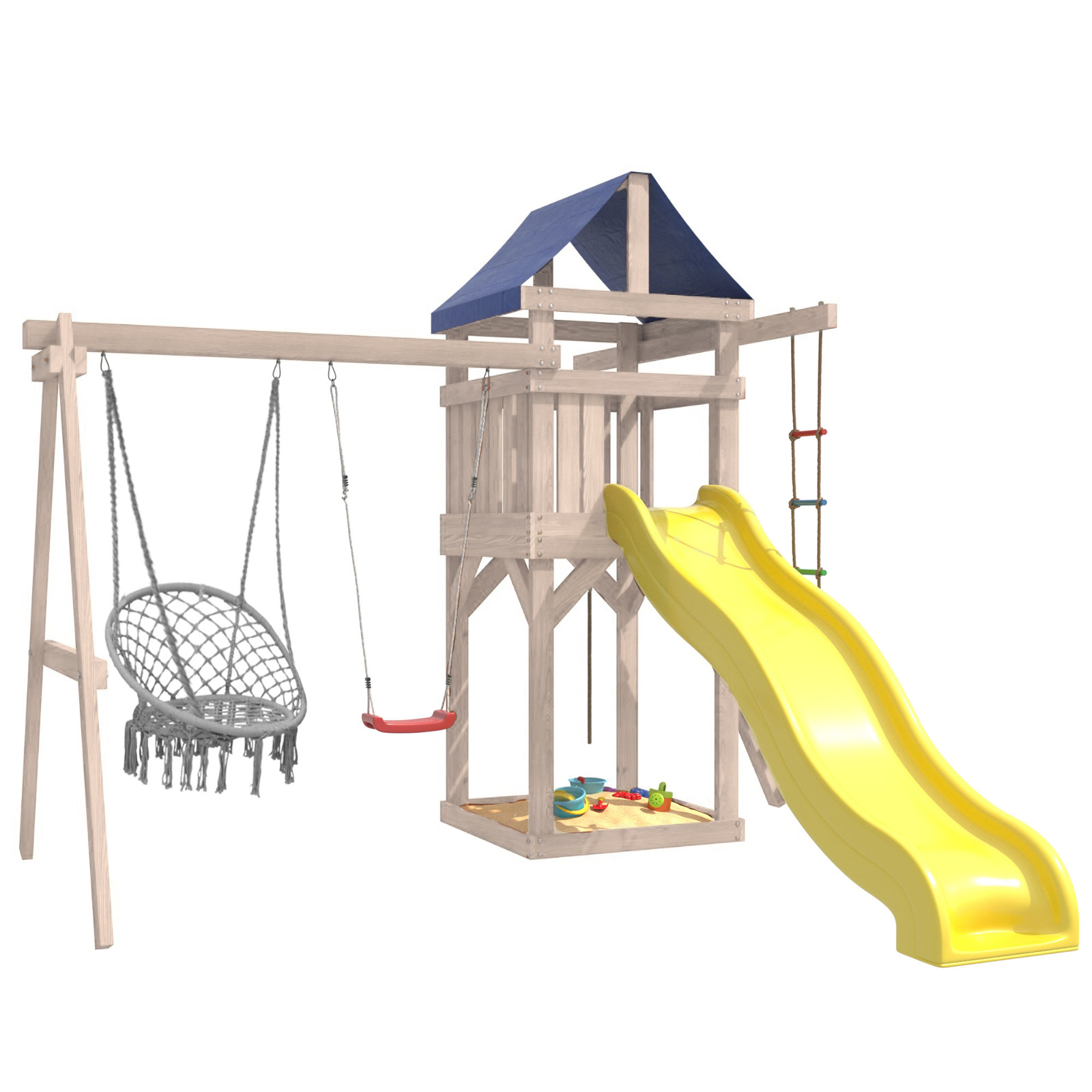 Детская площадка IgroWoods - отличное решение для активного отдыха детей на свежем воздухе. Она представляет собой многофункциональный игровой комплекс, который включает в себя горку, качели, песочницу, игровую веранду, веревочную лестницу, скалодром и канат. Все элементы выполнены из качественных и безопасных материалов, что обеспечивает долговечность и надежность конструкции.