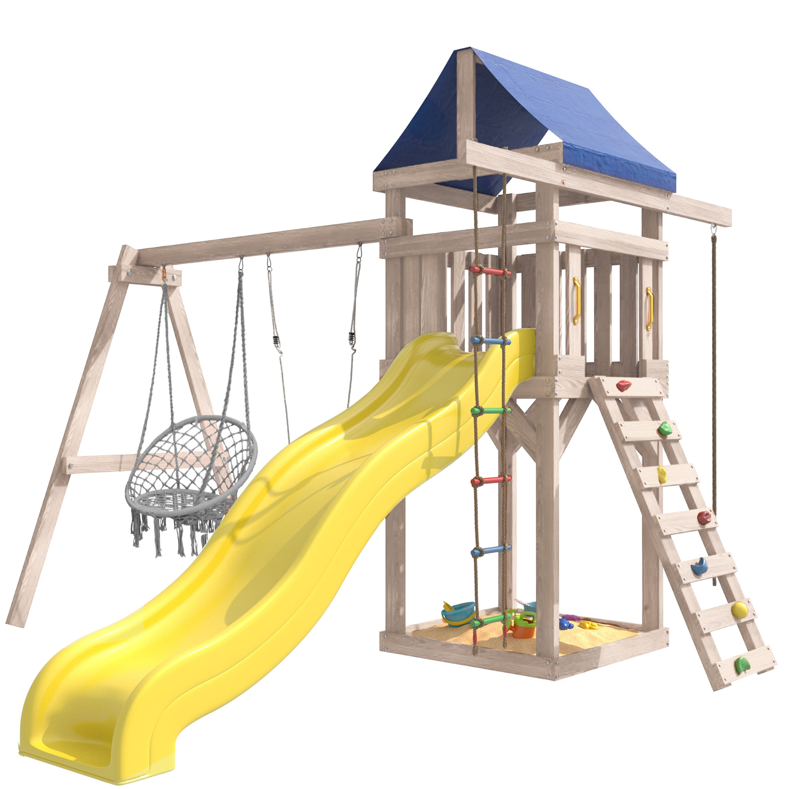 Площадка изготавливается из лесоматериалов лиственных и хвойных пород. Материал имеет естественную древесную текстуру. Все элементы проходят предварительную шлифовку, а края изделия закруглены. Небольшое количество металлических элементов значительно исключает возможность получения ребенком травм.