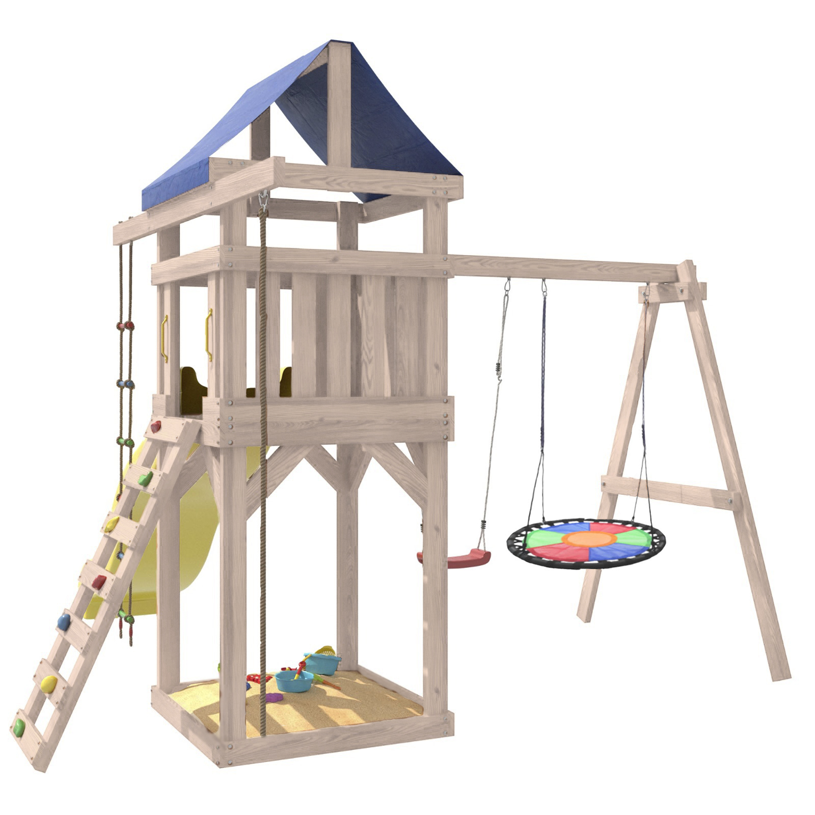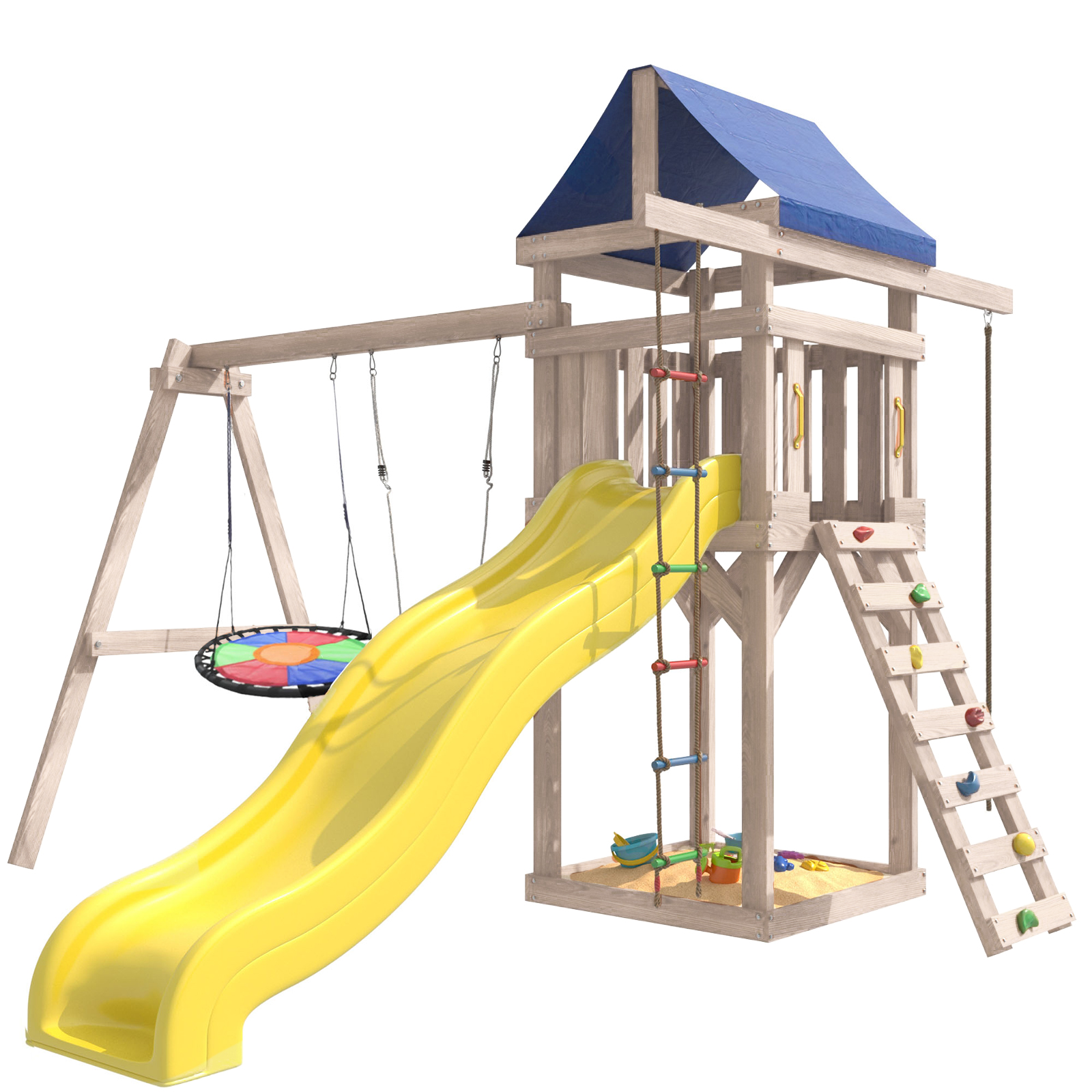 Площадка изготавливается из лесоматериалов лиственных и хвойных пород. Материал имеет естественную древесную текстуру. Все элементы проходят предварительную шлифовку, а края изделия закруглены. Небольшое количество металлических элементов значительно исключает возможность получения ребенком травм.
