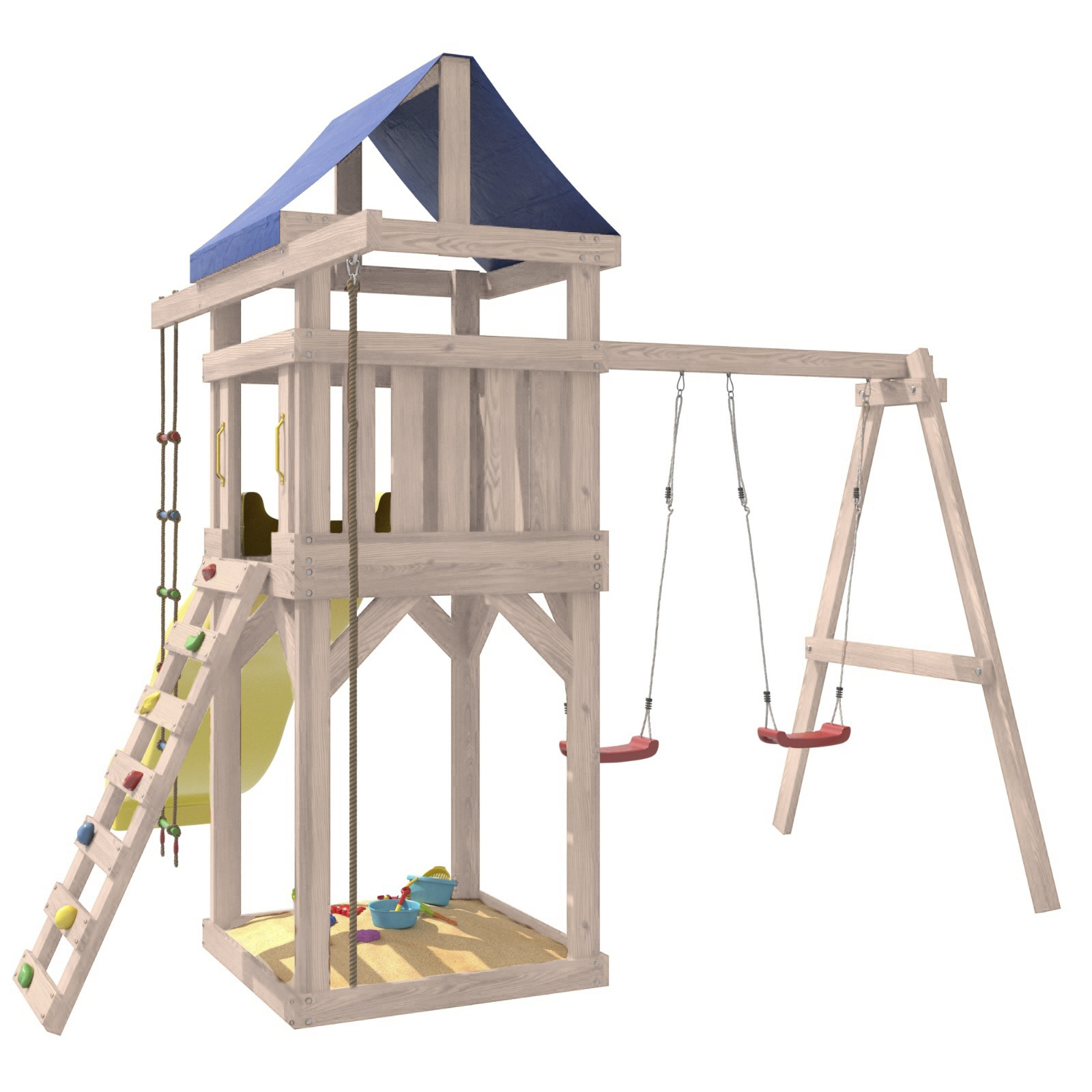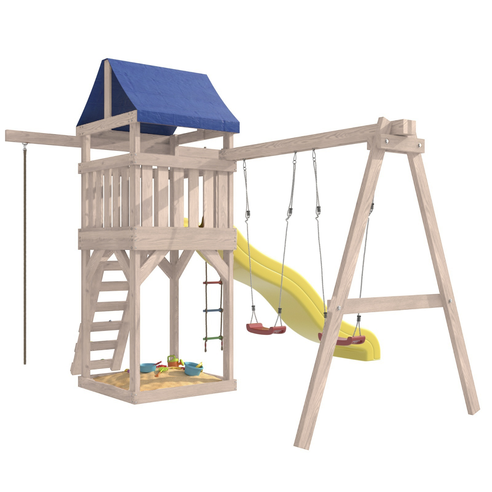 Площадка изготавливается из лесоматериалов лиственных и хвойных пород. Материал имеет естественную древесную текстуру. Все элементы проходят предварительную шлифовку, а края изделия закруглены. Небольшое количество металлических элементов значительно исключает возможность получения ребенком травм.