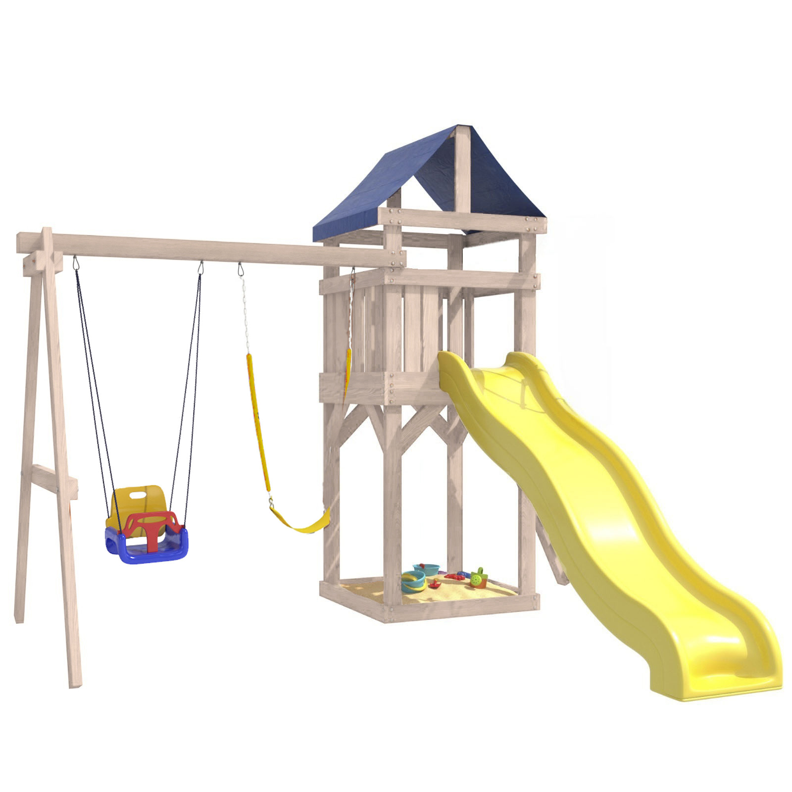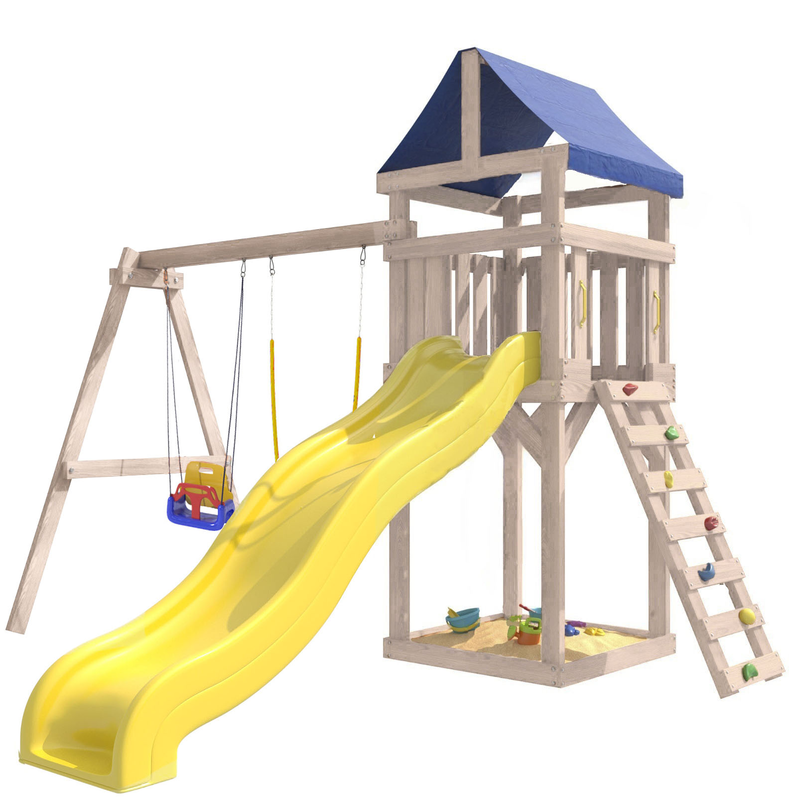 Площадка изготавливается из лесоматериалов лиственных и хвойных пород. Материал имеет естественную древесную текстуру. Все элементы проходят предварительную шлифовку, а края изделия закруглены. Небольшое количество металлических элементов значительно исключает возможность получения ребенком травм.