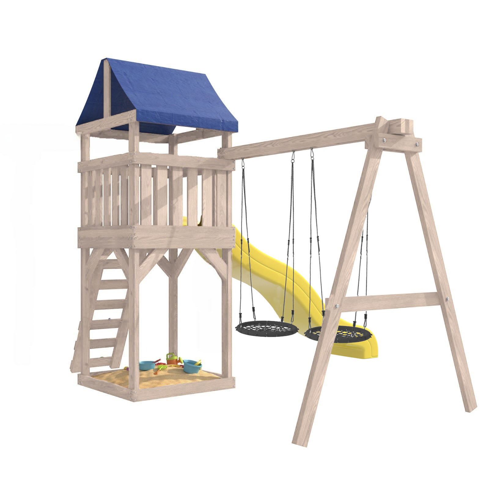 Площадка изготавливается из лесоматериалов лиственных и хвойных пород. Материал имеет естественную древесную текстуру. Все элементы проходят предварительную шлифовку, а края изделия закруглены. Небольшое количество металлических элементов значительно исключает возможность получения ребенком травм.