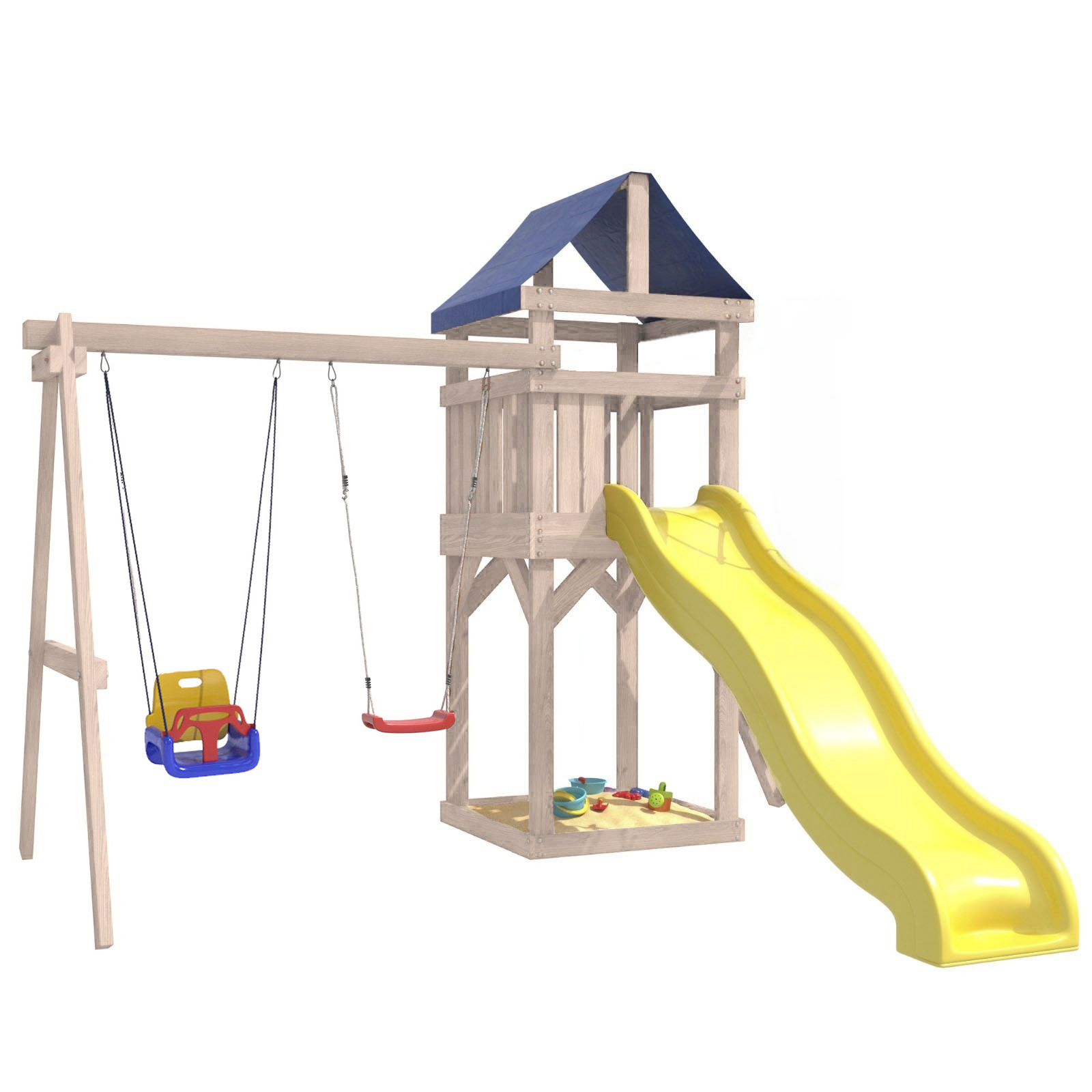 Площадка изготавливается из лесоматериалов лиственных и хвойных пород. Материал имеет естественную древесную текстуру. Все элементы проходят предварительную шлифовку, а края изделия закруглены. Небольшое количество металлических элементов значительно исключает возможность получения ребенком травм.