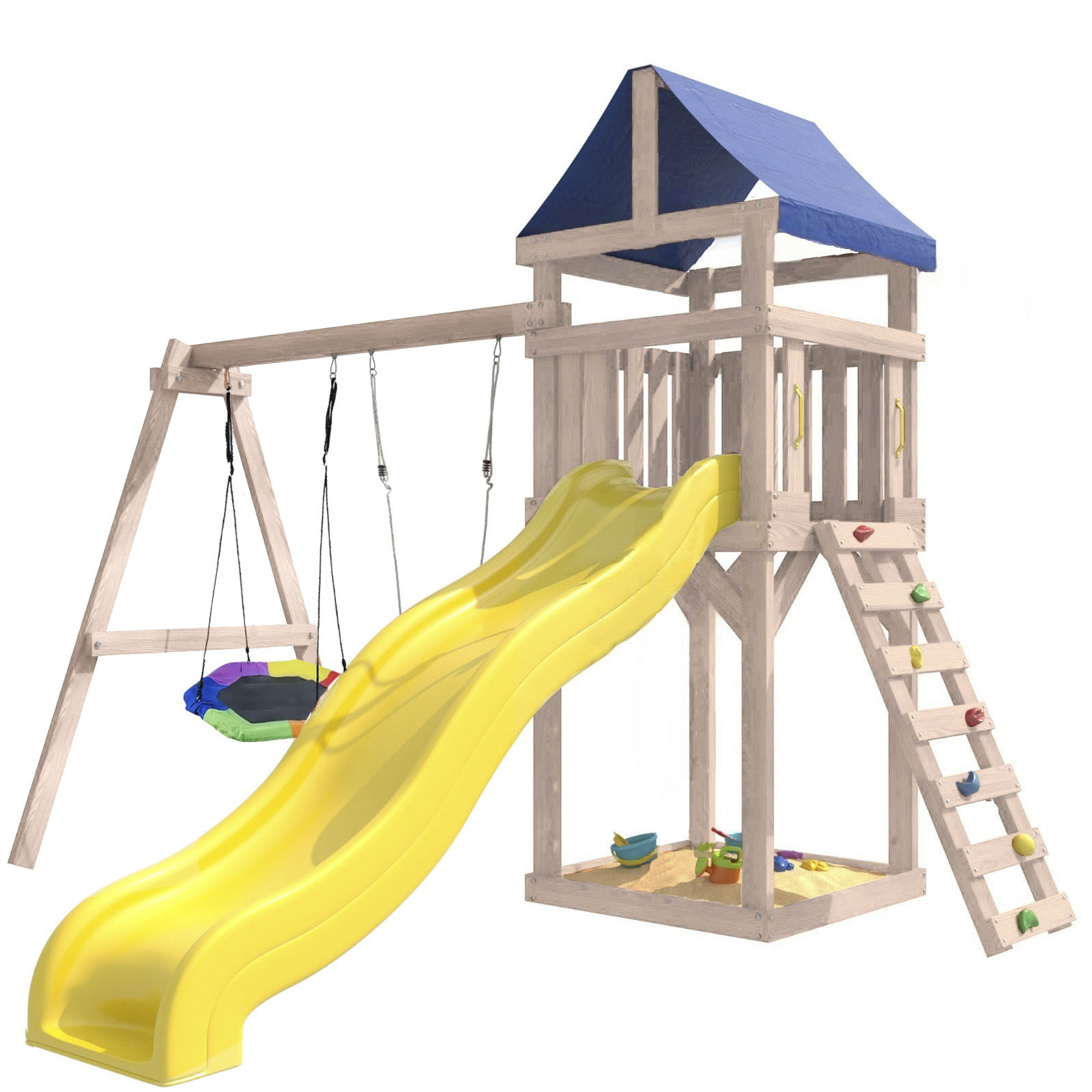 Площадка изготавливается из лесоматериалов лиственных и хвойных пород. Материал имеет естественную древесную текстуру. Все элементы проходят предварительную шлифовку, а края изделия закруглены. Небольшое количество металлических элементов значительно исключает возможность получения ребенком травм.