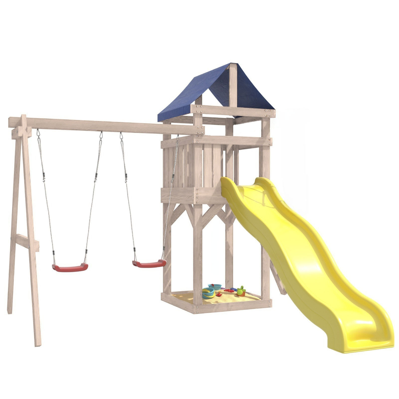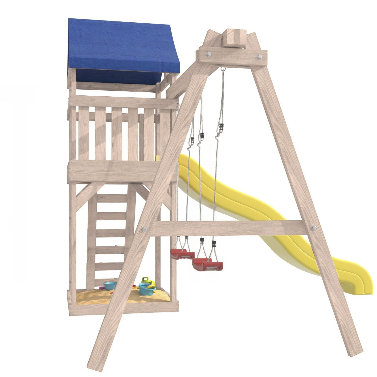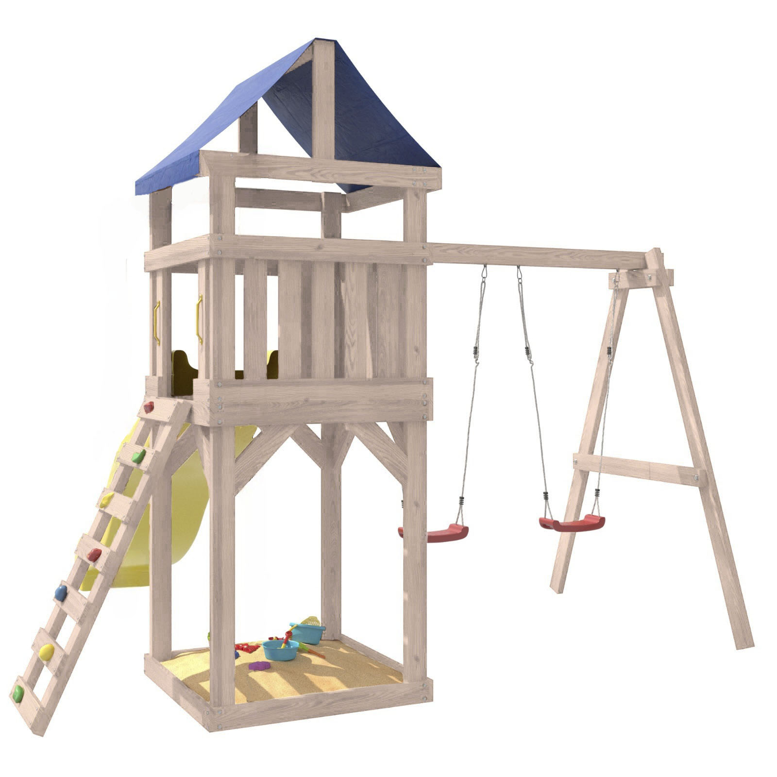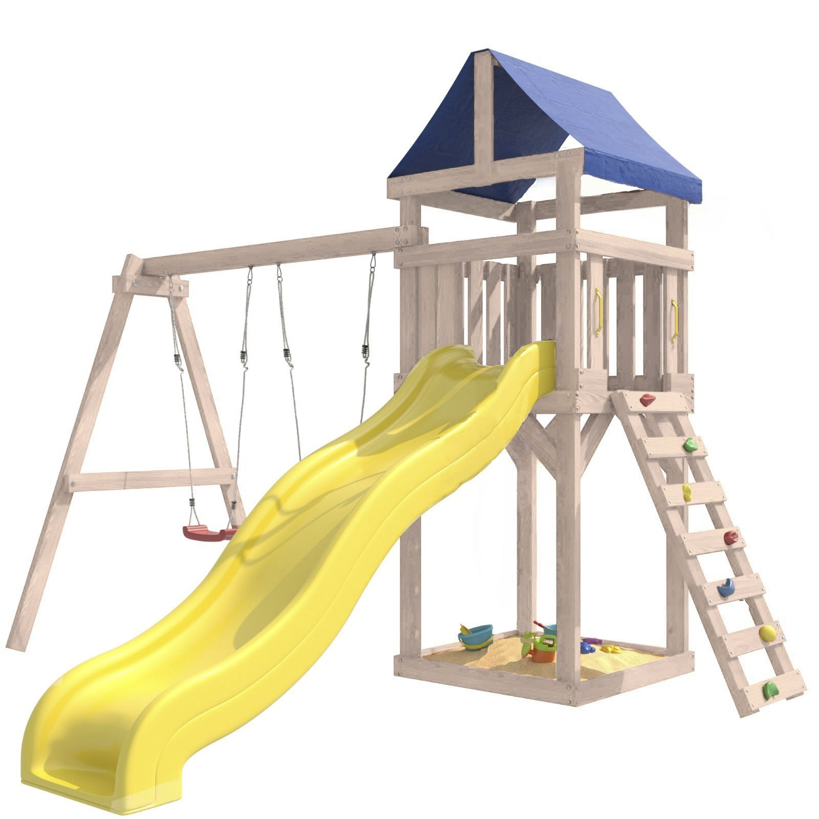 Площадка изготавливается из лесоматериалов лиственных и хвойных пород. Материал имеет естественную древесную текстуру. Все элементы проходят предварительную шлифовку, а края изделия закруглены. Небольшое количество металлических элементов значительно исключает возможность получения ребенком травм.