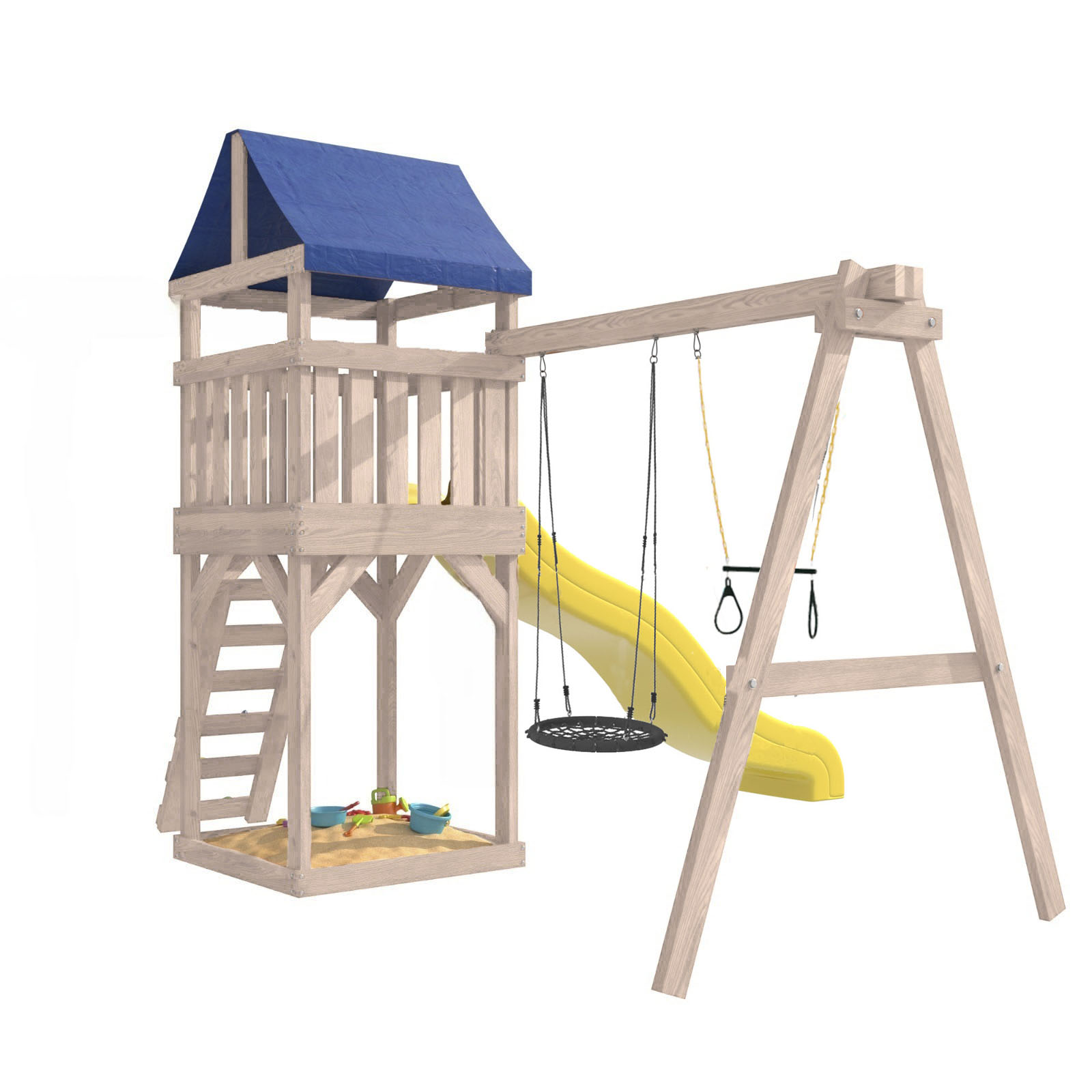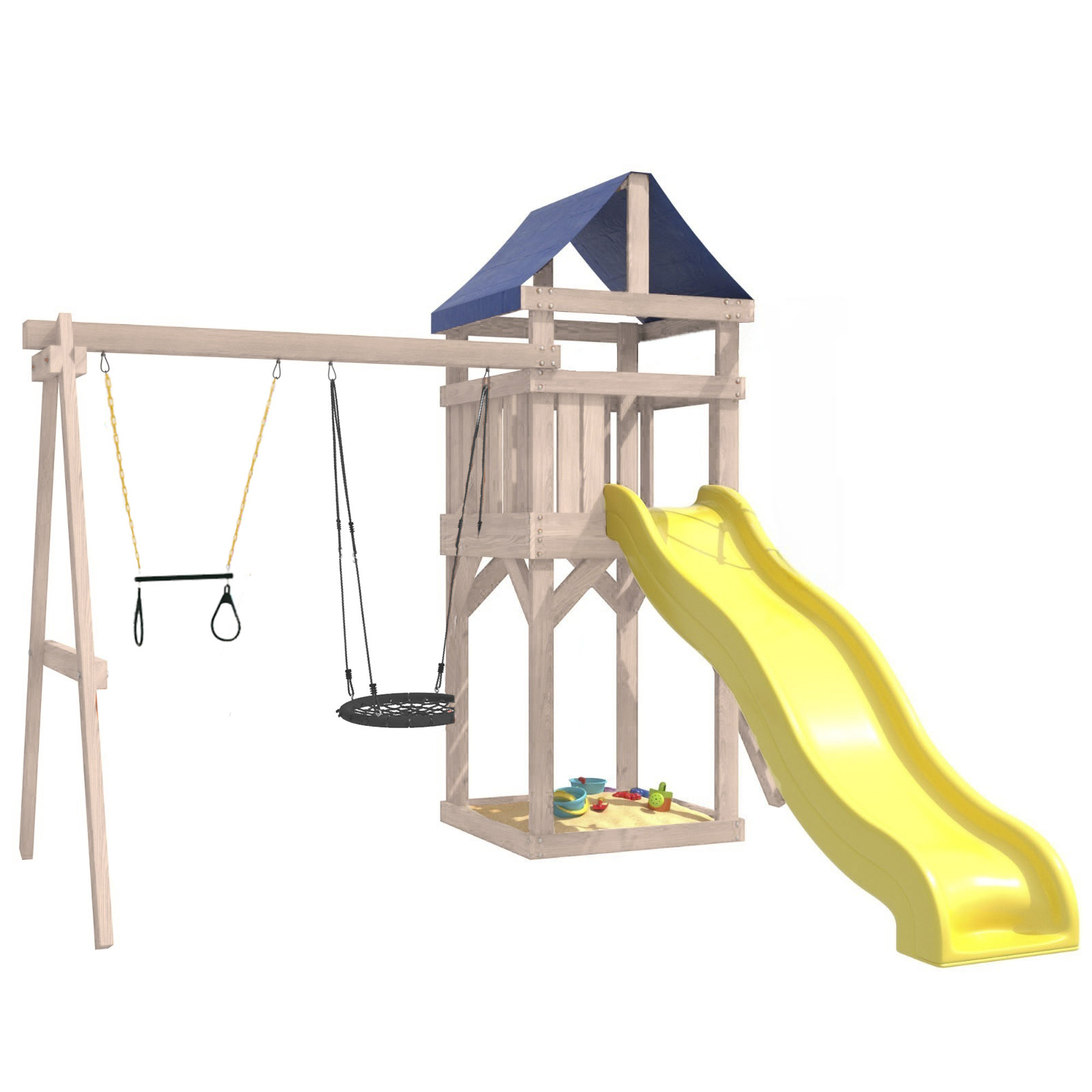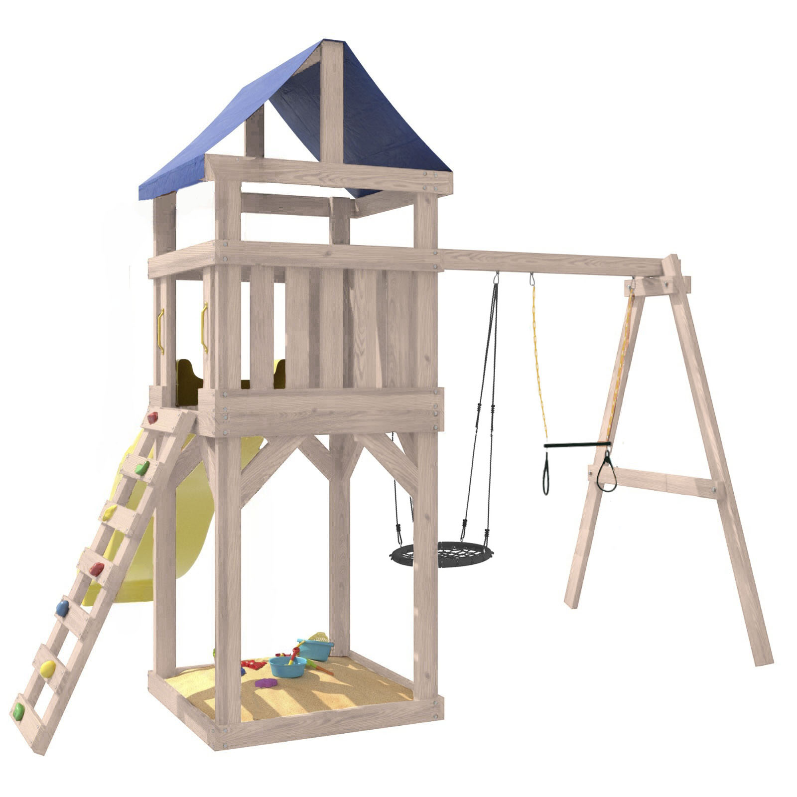 Площадка изготавливается из лесоматериалов лиственных и хвойных пород. Материал имеет естественную древесную текстуру. Все элементы проходят предварительную шлифовку, а края изделия закруглены. Небольшое количество металлических элементов значительно исключает возможность получения ребенком травм.