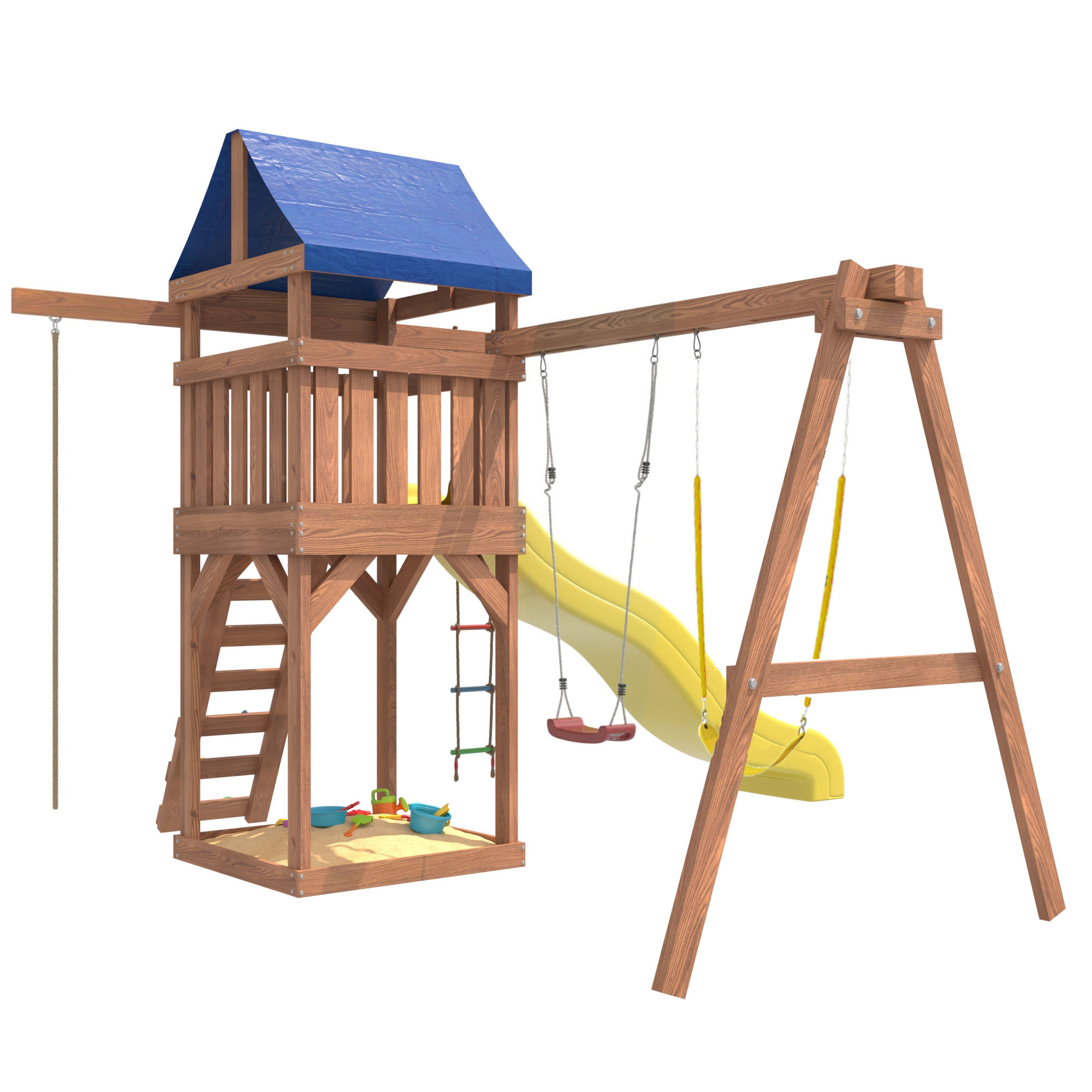 Площадка изготавливается из лесоматериалов лиственных и хвойных пород. Материал имеет естественную древесную текстуру, обработан специальными составами для большего срока использования и предохранения от разрушения древесины. Все элементы проходят предварительную шлифовку, а края изделия закруглены. Небольшое количество металлических элементов значительно исключает возможность получения ребенком травм.