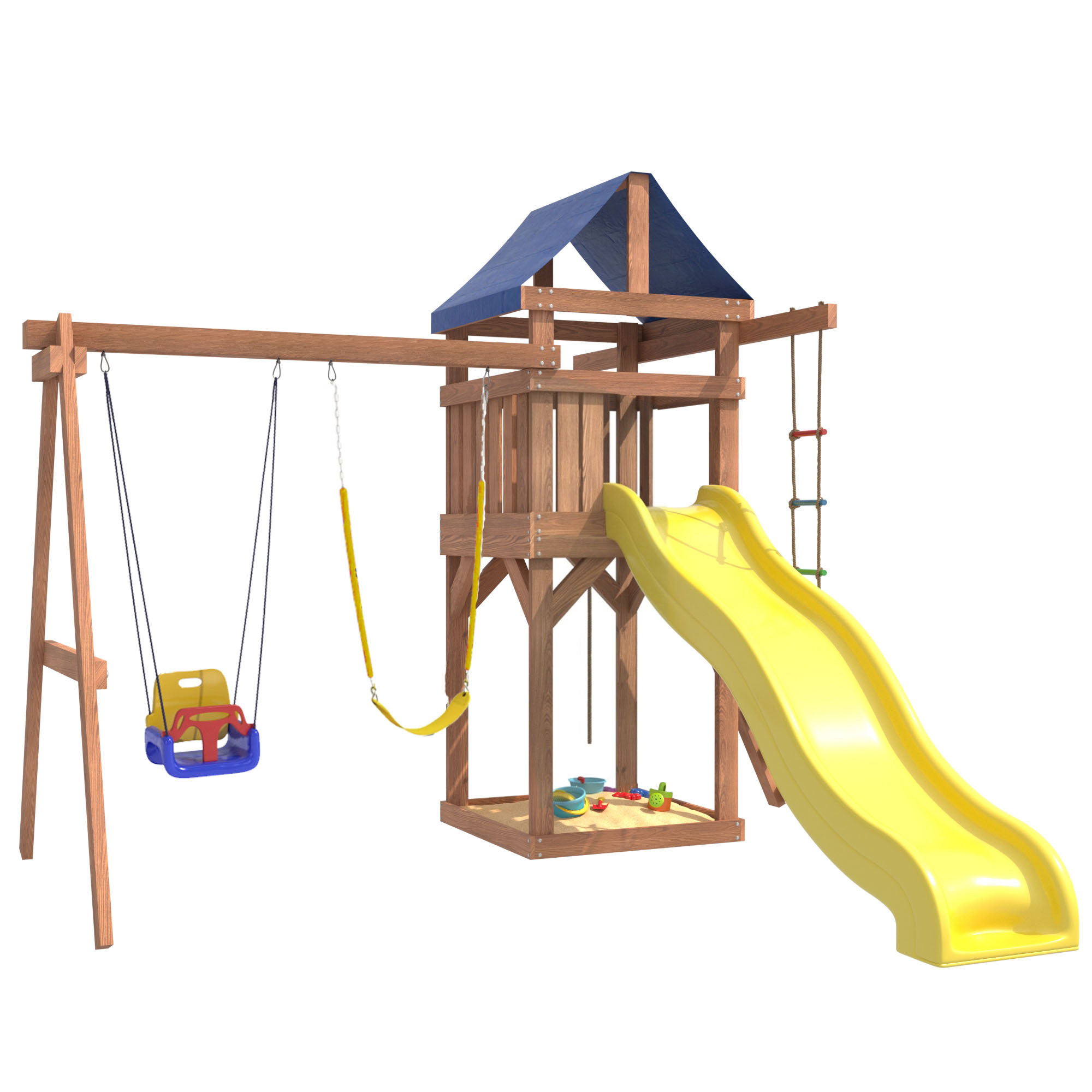 Площадка изготавливается из лесоматериалов лиственных и хвойных пород. Материал имеет естественную древесную текстуру, обработан специальными составами для большего срока использования и предохранения от разрушения древесины. Все элементы проходят предварительную шлифовку, а края изделия закруглены. Небольшое количество металлических элементов значительно исключает возможность получения ребенком травм.