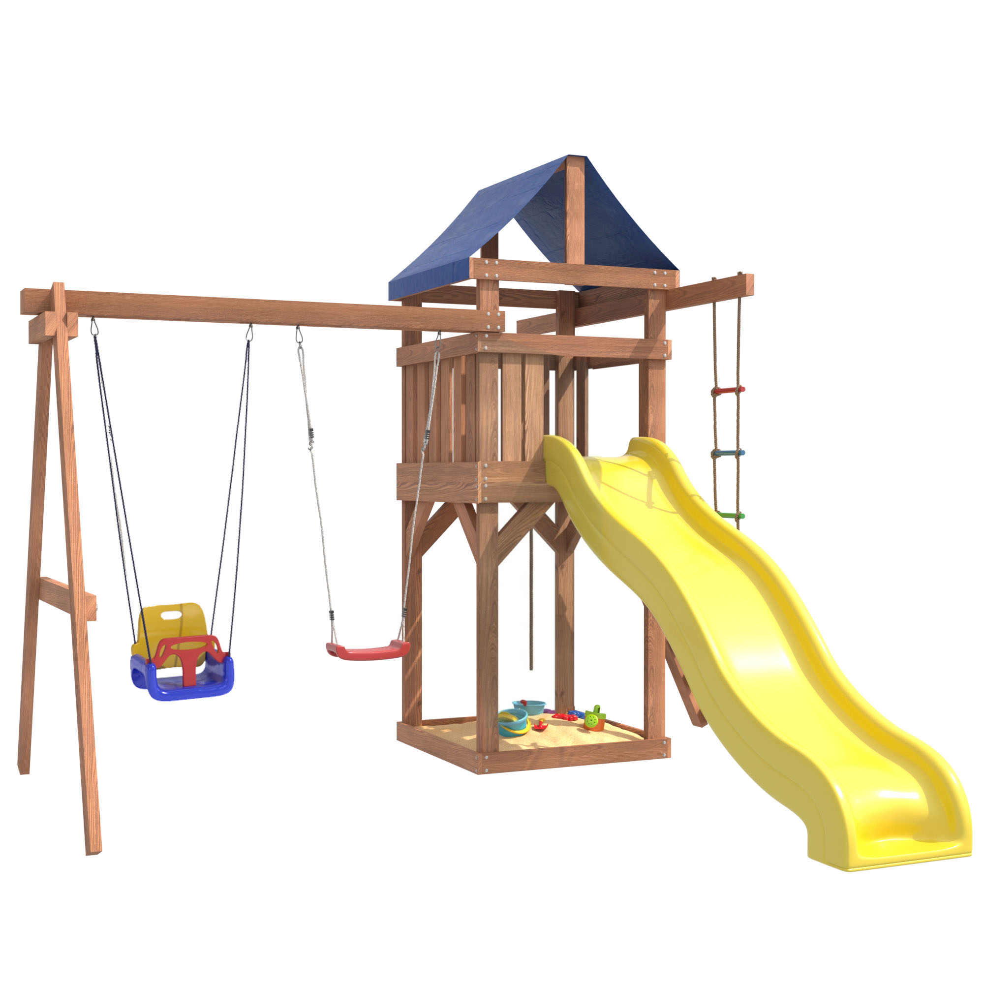 Площадка изготавливается из лесоматериалов лиственных и хвойных пород. Материал имеет естественную древесную текстуру, обработан специальными составами для большего срока использования и предохранения от разрушения древесины. Все элементы проходят предварительную шлифовку, а края изделия закруглены. Небольшое количество металлических элементов значительно исключает возможность получения ребенком травм.