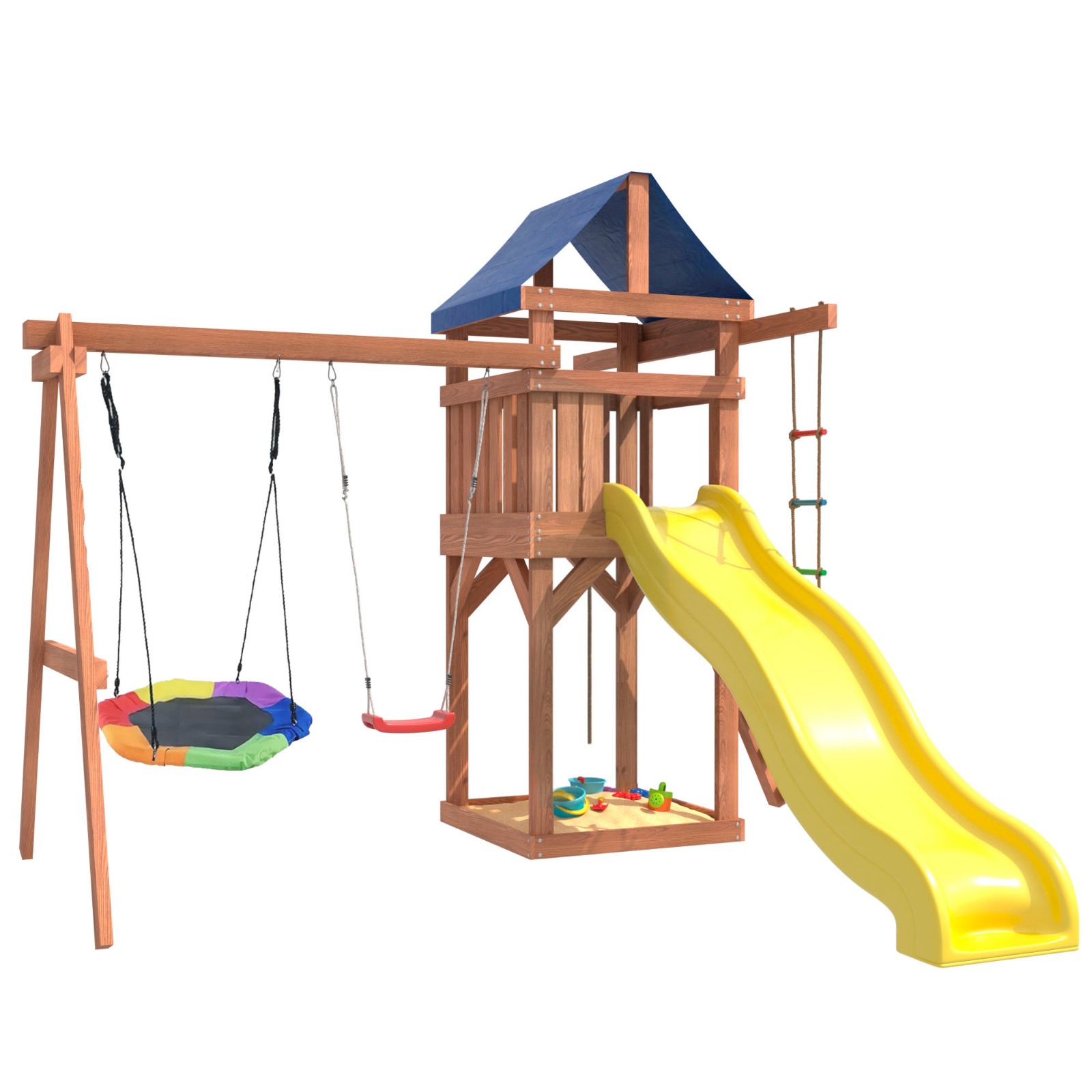 Площадка изготавливается из лесоматериалов лиственных и хвойных пород. Материал имеет естественную древесную текстуру, обработан специальными составами для большего срока использования и предохранения от разрушения древесины. Все элементы проходят предварительную шлифовку, а края изделия закруглены. Небольшое количество металлических элементов значительно исключает возможность получения ребенком травм.