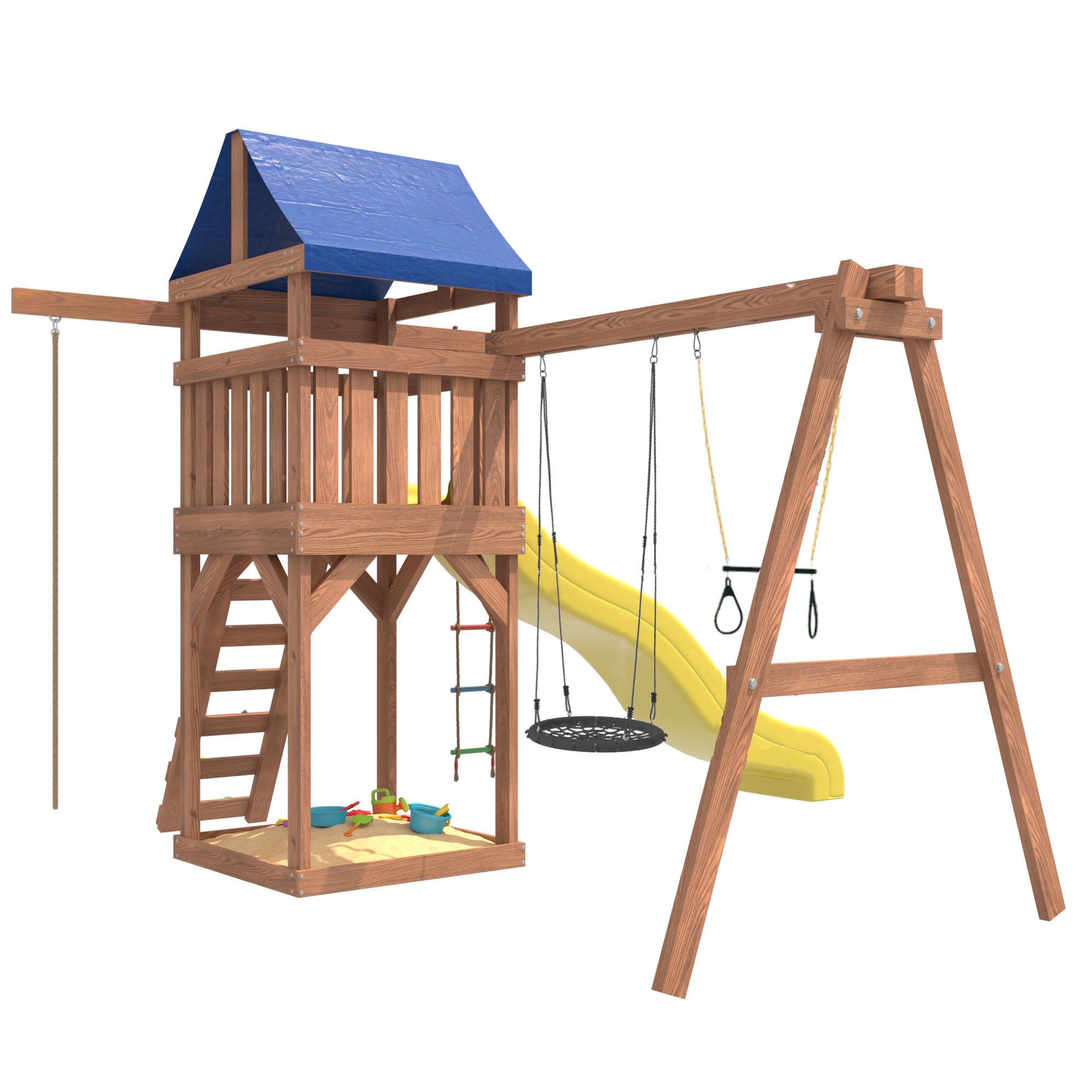 Площадка изготавливается из лесоматериалов лиственных и хвойных пород. Материал имеет естественную древесную текстуру, обработан специальными составами для большего срока использования и предохранения от разрушения древесины. Все элементы проходят предварительную шлифовку, а края изделия закруглены. Небольшое количество металлических элементов значительно исключает возможность получения ребенком травм.