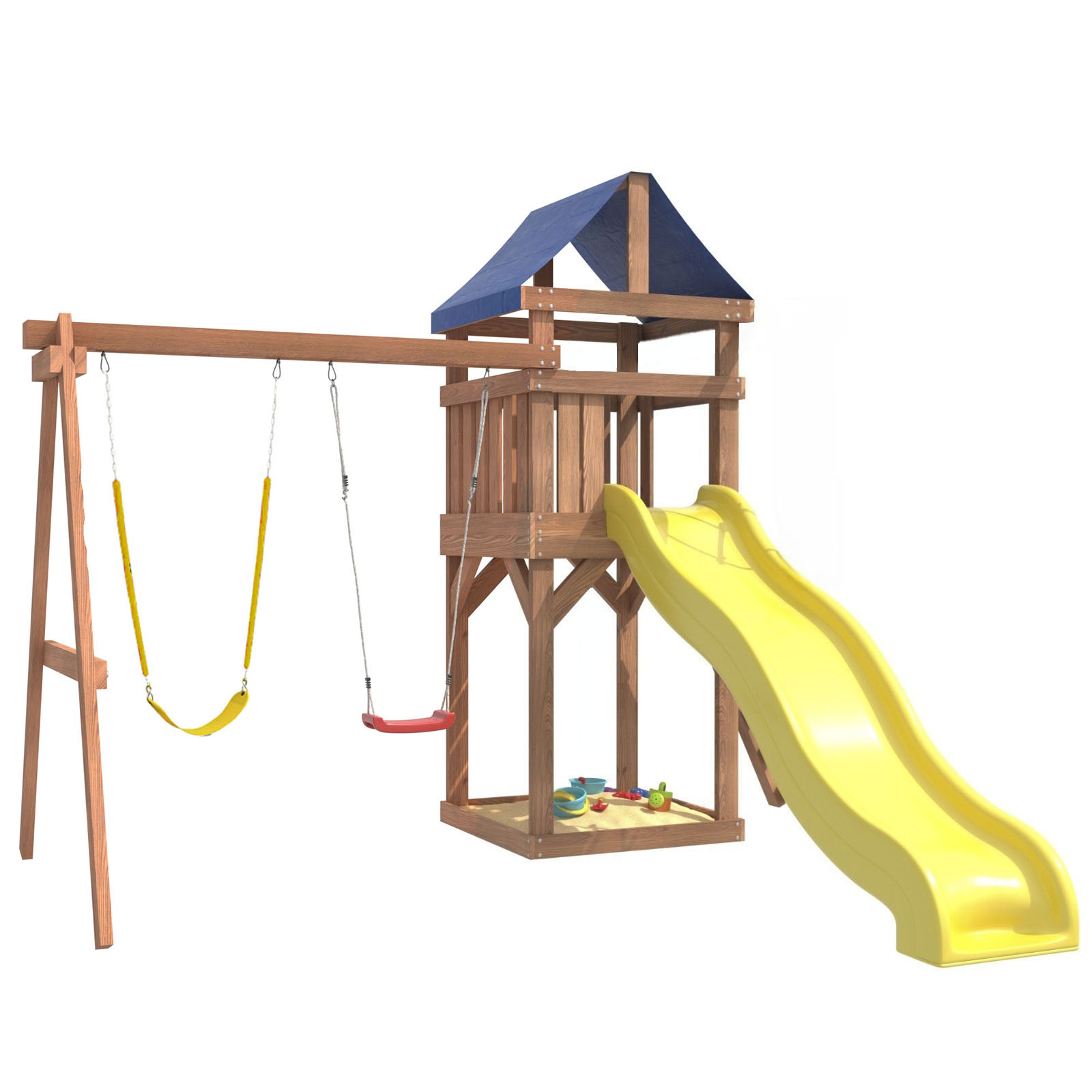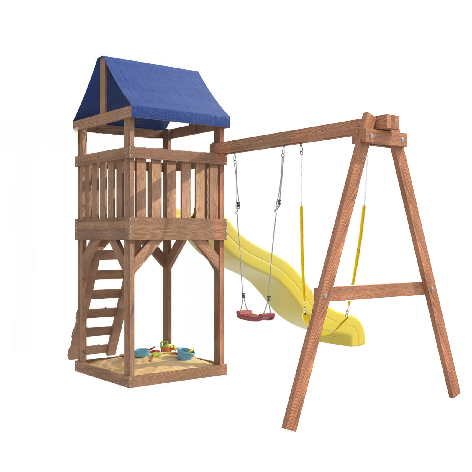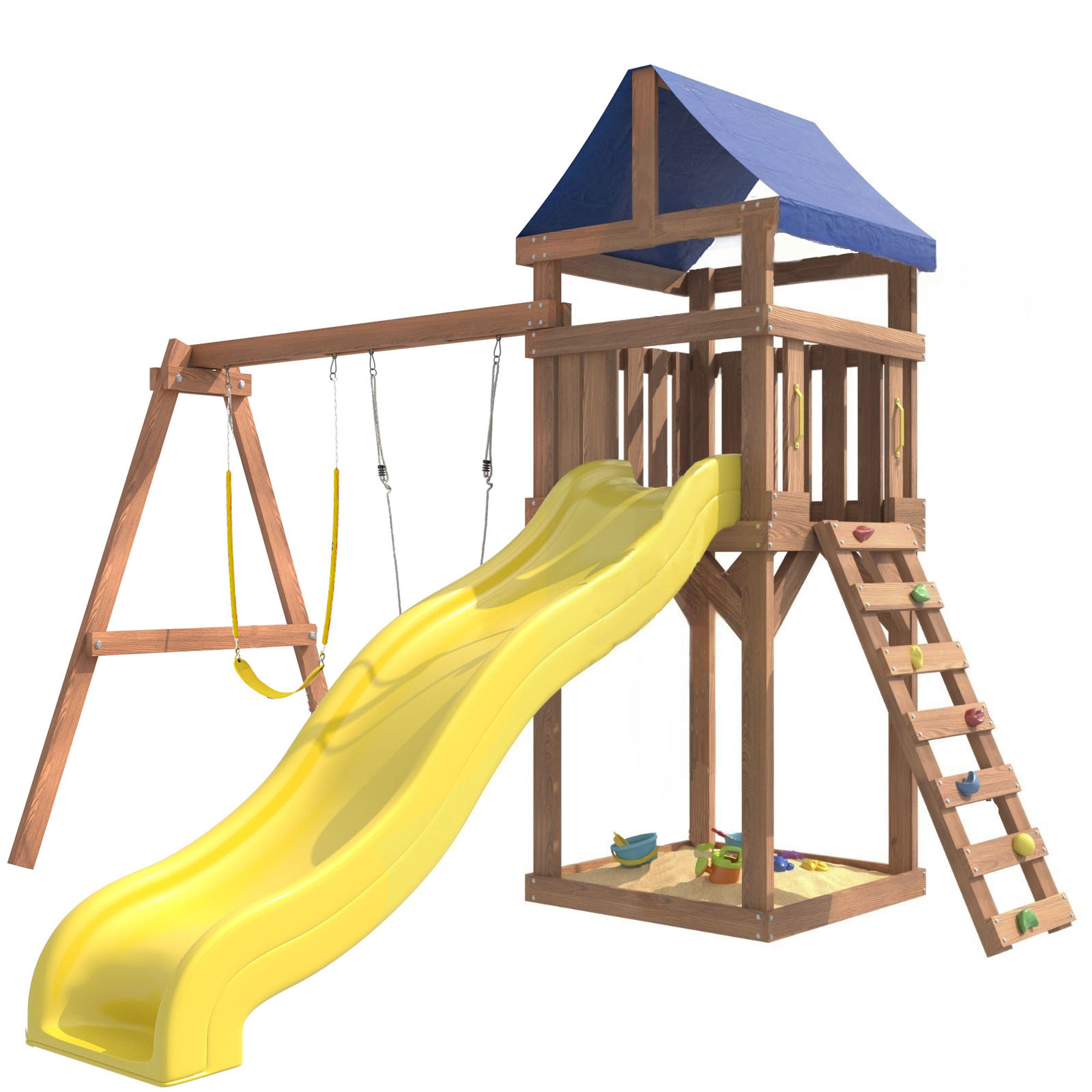 Площадка изготавливается из лесоматериалов лиственных и хвойных пород. Материал имеет естественную древесную текстуру, обработан специальными составами для большего срока использования и предохранения от разрушения древесины. Все элементы проходят предварительную шлифовку, а края изделия закруглены. Небольшое количество металлических элементов значительно исключает возможность получения ребенком травм.