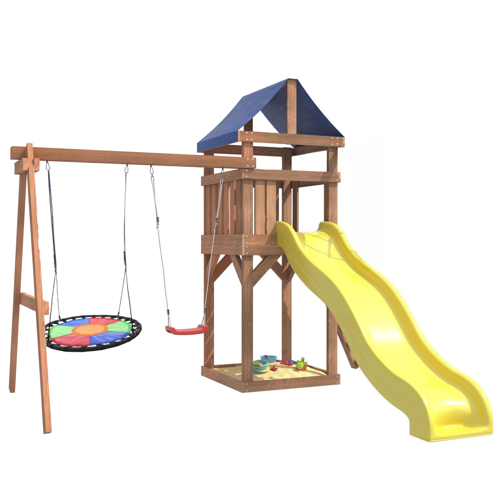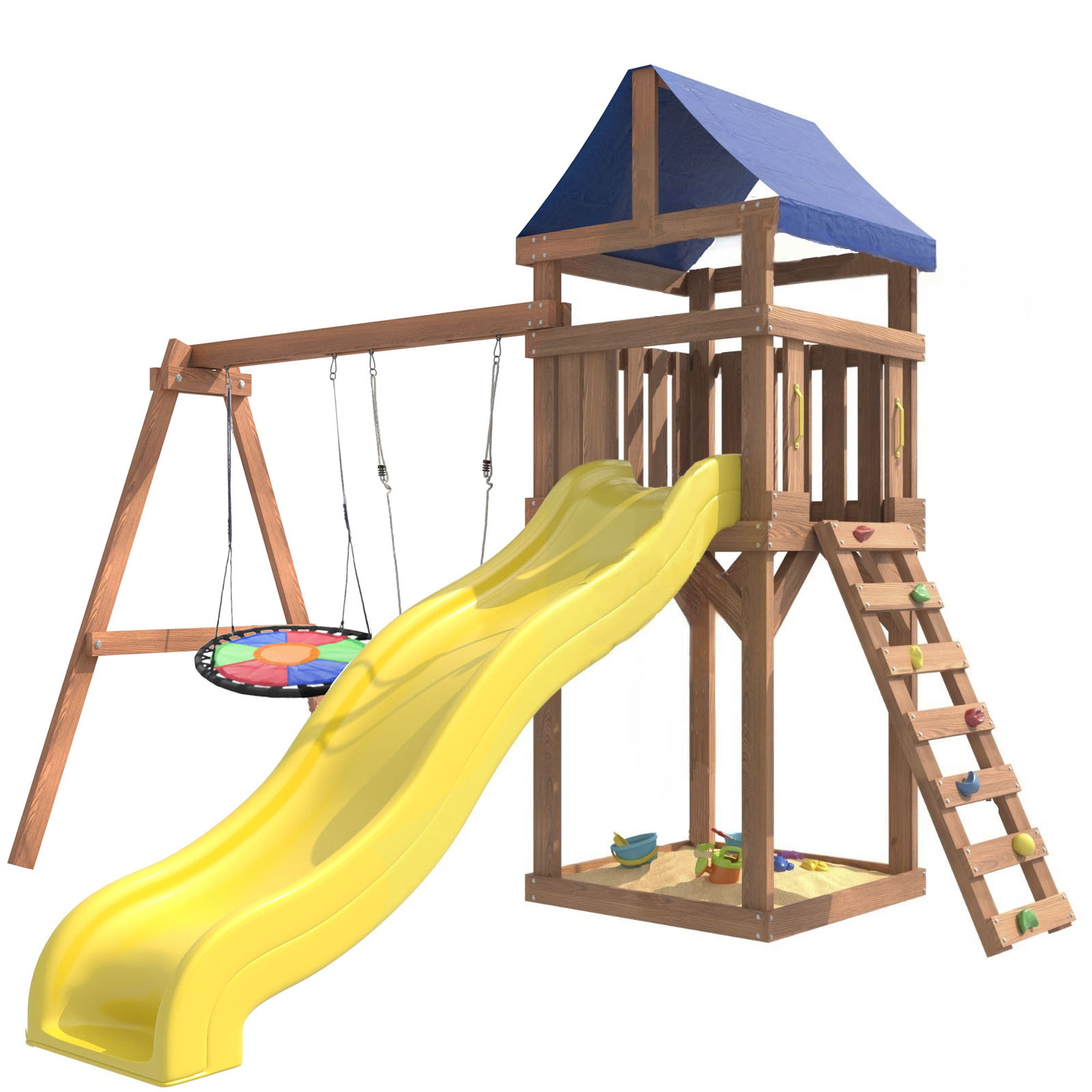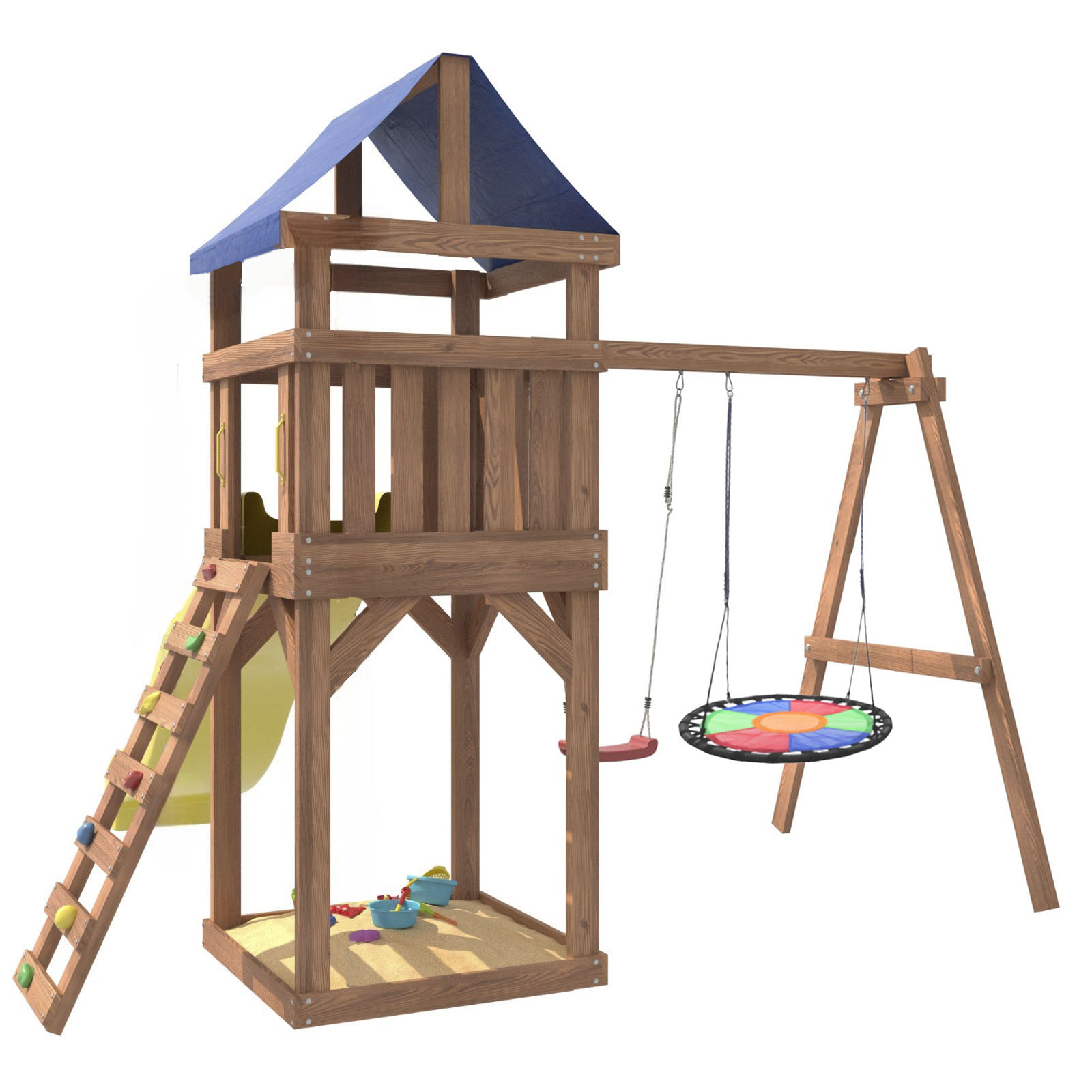 Площадка изготавливается из лесоматериалов лиственных и хвойных пород. Материал имеет естественную древесную текстуру, обработан специальными составами для большего срока использования и предохранения от разрушения древесины. Все элементы проходят предварительную шлифовку, а края изделия закруглены. Небольшое количество металлических элементов значительно исключает возможность получения ребенком травм.