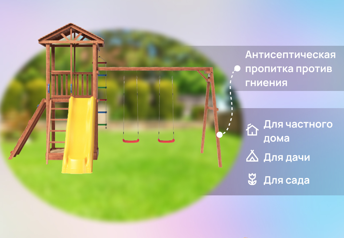 Площадка изготавливается из лесоматериалов лиственных и хвойных пород. Материал имеет естественную древесную текстуру, обработан специальными составами для большего срока использования и предохранения от разрушения древесины. Все элементы проходят предварительную шлифовку - Ваш ребенок никогда не получит заусенцы.