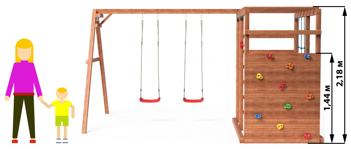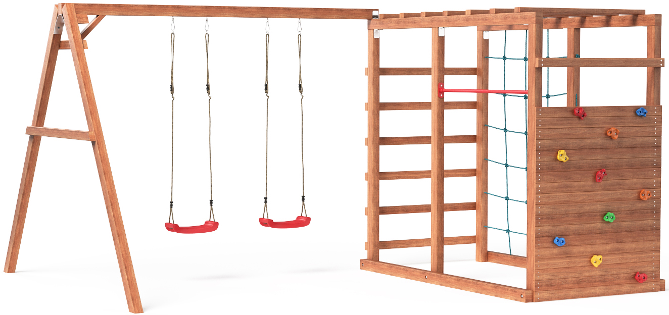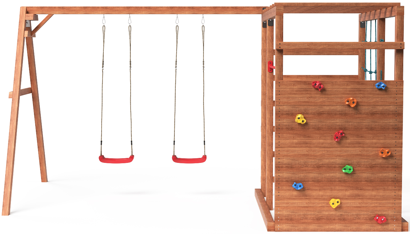 Площадка изготавливается из лесоматериалов лиственных и хвойных пород. Материал имеет естественную древесную текстуру, обработан специальными составами для большего срока использования и предохранения от разрушения древесины. Все элементы проходят предварительную шлифовку - Ваш ребенок никогда не получит заусенцы.
