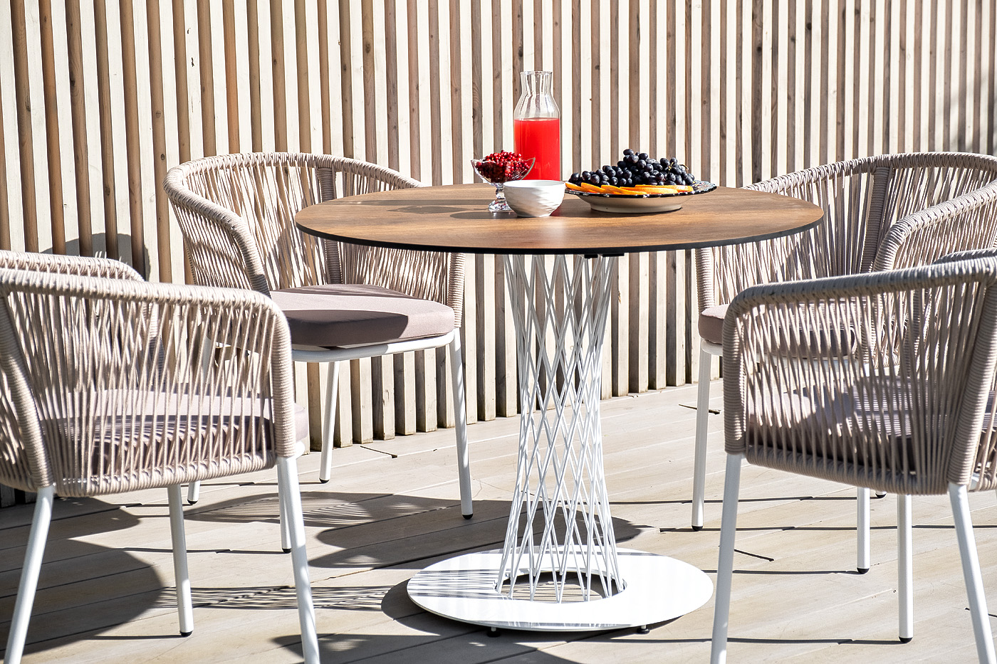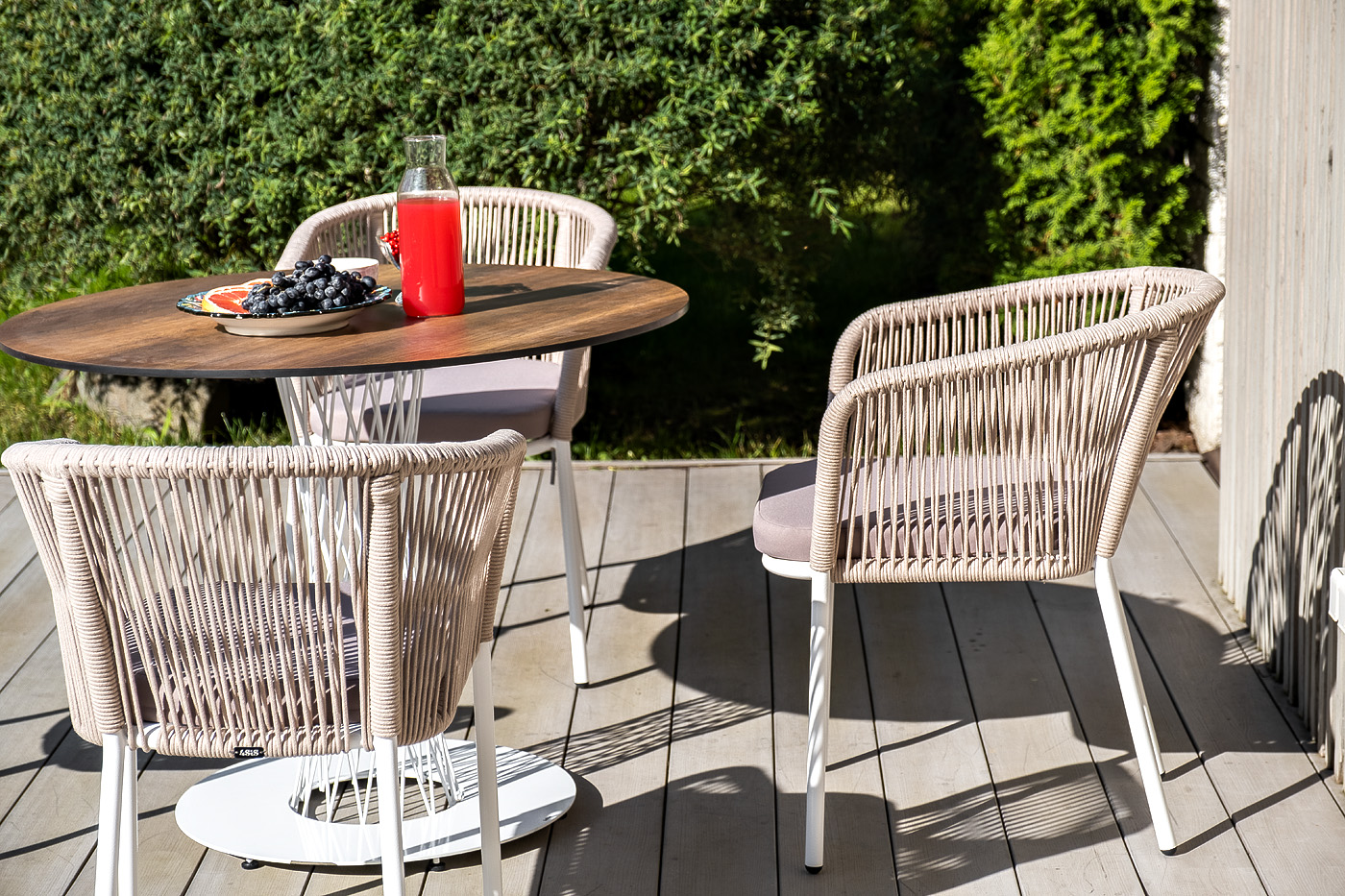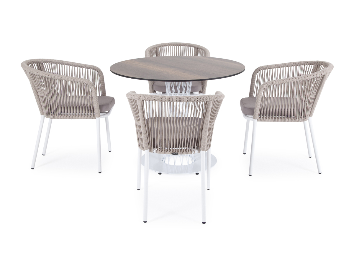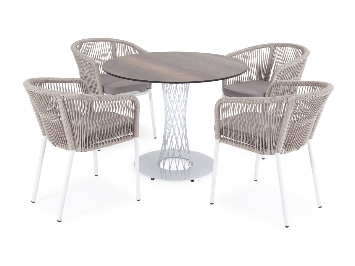 В комплект также входят подушки с влагооттал "Диего" обеденный стол из HPL круглый Ø100см, цвет "дуб", каркас черный 1шт. 1 000Х1 000Х750, "Марсель" стул плетеный из роупа, каркас алюминий белый муар, роуп бежевый круглый, ткань бежевая 052 4шт. 570Х620Х775,