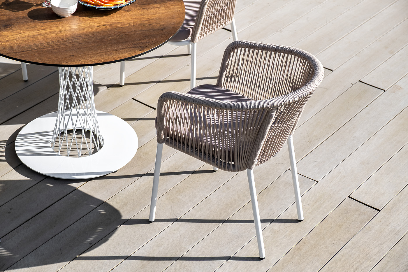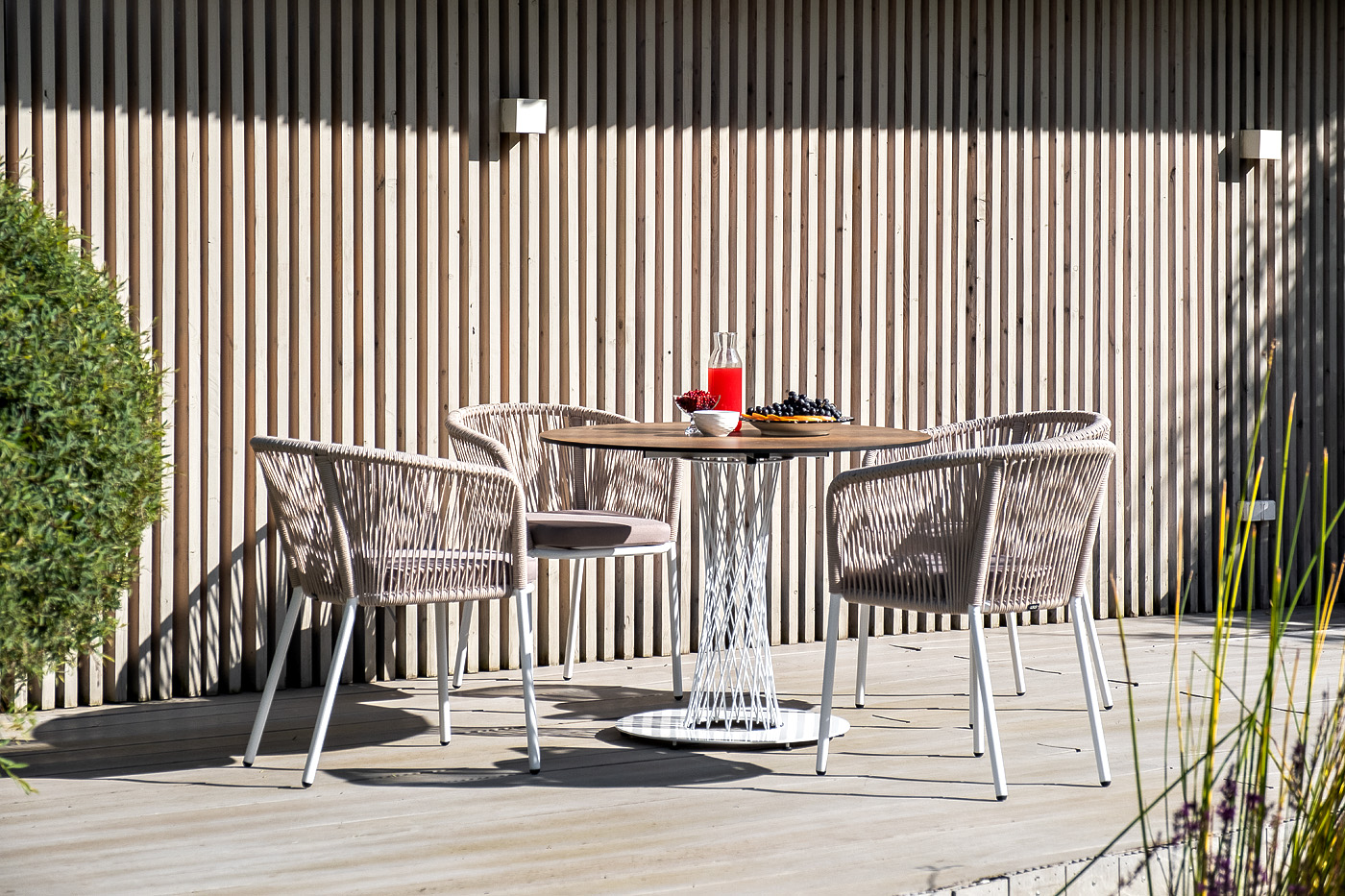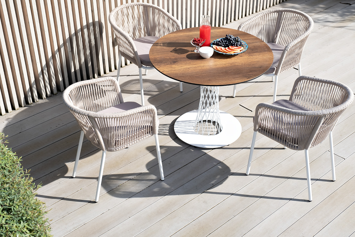 В комплект также входят подушки с влагооттал "Диего" обеденный стол из HPL круглый Ø100см, цвет "дуб", каркас черный 1шт. 1 000Х1 000Х750, "Марсель" стул плетеный из роупа, каркас алюминий белый муар, роуп бежевый круглый, ткань бежевая 052 4шт. 570Х620Х775,