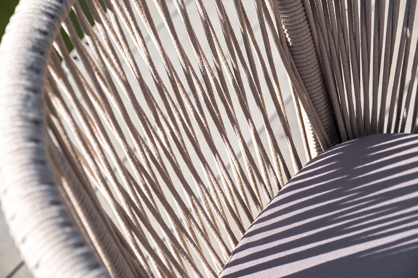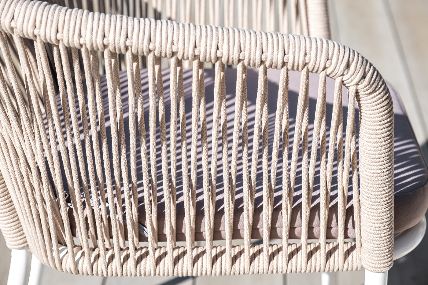 4 кресла из коллекции «Марсель», выполненных из алюминиевого каркаса и ручной оплетки роупом. Это эластичные синтетические ленты из высокопрочных полиэфирных волокон, представлены в бежевом цвете.