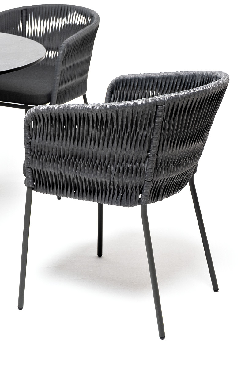 Вместе с этим, в комплектацию входит 4 плетеных стула «Бордо», выполненных с использованием высокопрочного роуп-волокна серого цвета с плетением вида «колос». Стулья имеют размеры 570×620×775 мм и устойчивый каркас из алюминия, окрашенной порошковой краской темно-серого цвета.