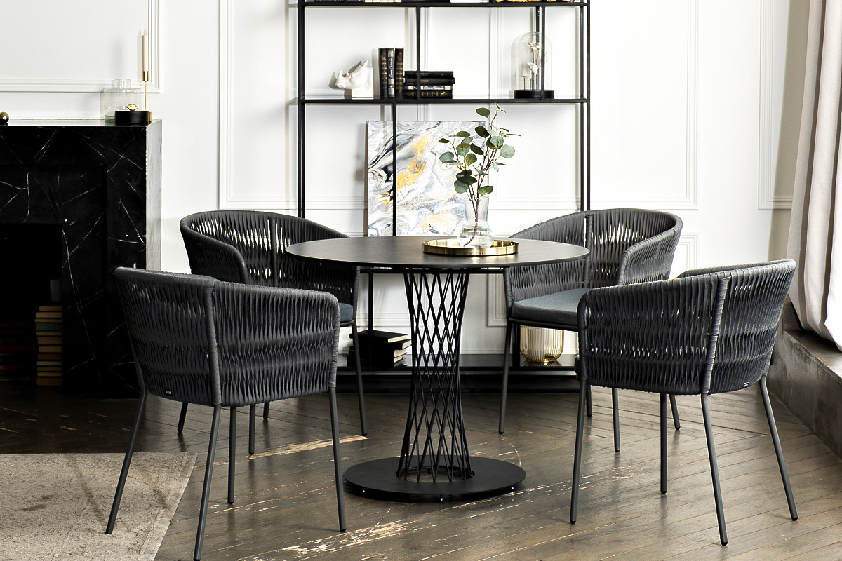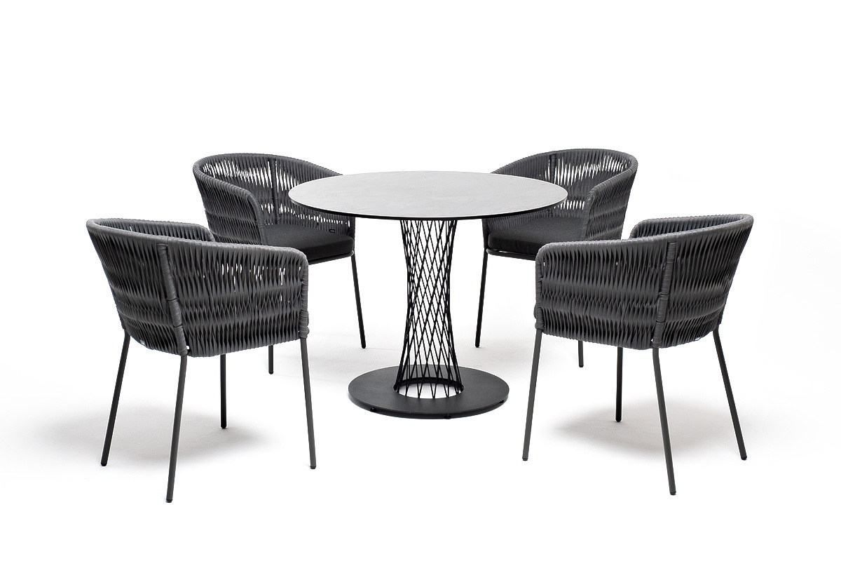 Обеденная группа «Диего» является стильным и практичным решением для обустройства кухни или жилой зоны, она идеально сочетается с различными интерьерами благодаря универсальности использованных материалов и цвета. Она подходит как для ежедневного использования, так и для приема гостей, обеспечивая удобство сидения и качественное исполнение всех элементов. "Диего" обеденный стол из HPL круглый Ø90см, цвет "серый гранит" 1шт. 900Х900Х750, "Бордо" стул плетеный из роупа (колос), каркас алюминий темно-серый (RAL7024) муар, роуп серый 15мм, ткань темно-серая 027 4шт. 570Х620Х775,