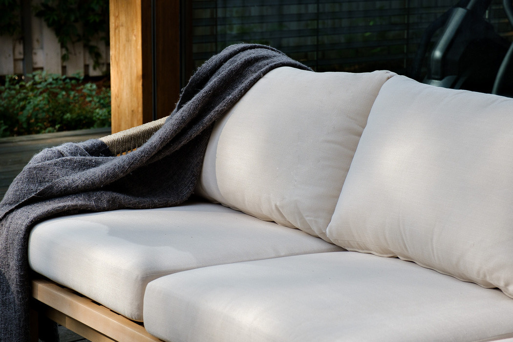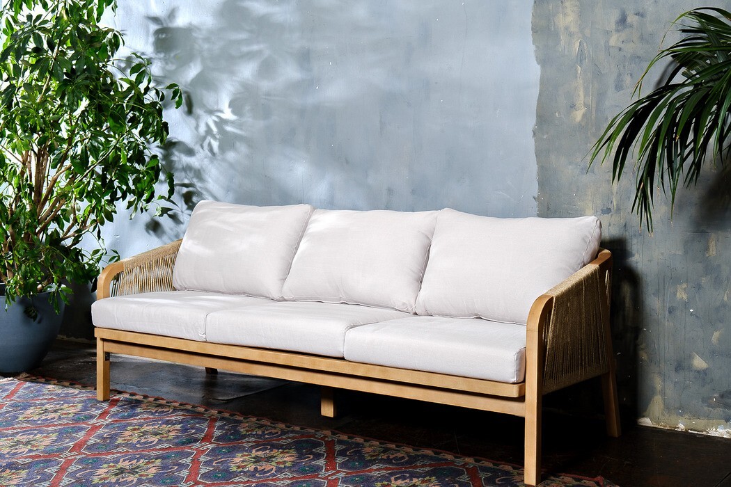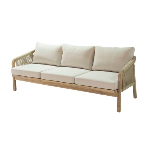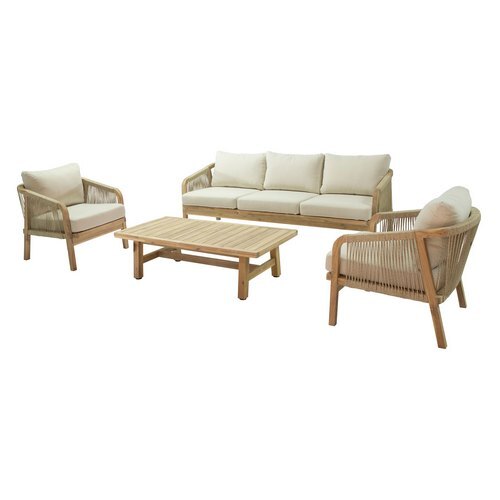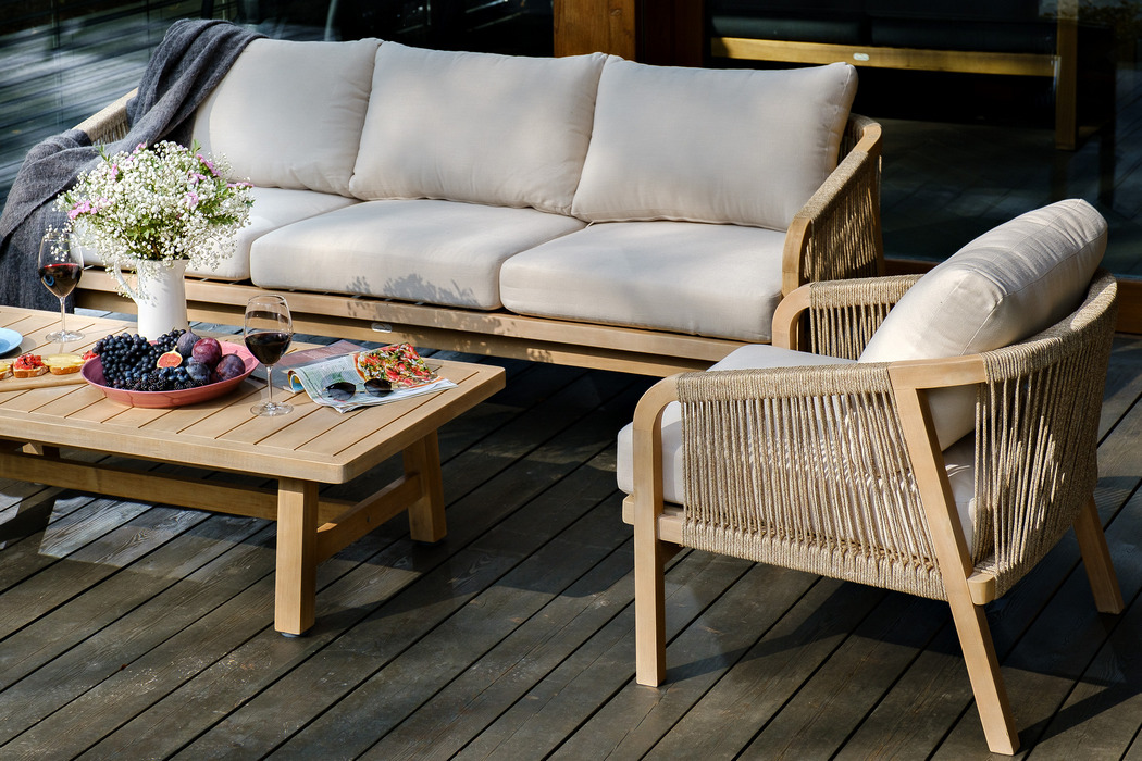 РИМИНИ – современная коллекция садовой мебели из акации, выполненная в комбинации натурального веревочного плетения rope, массива акации и бежевых подушек.