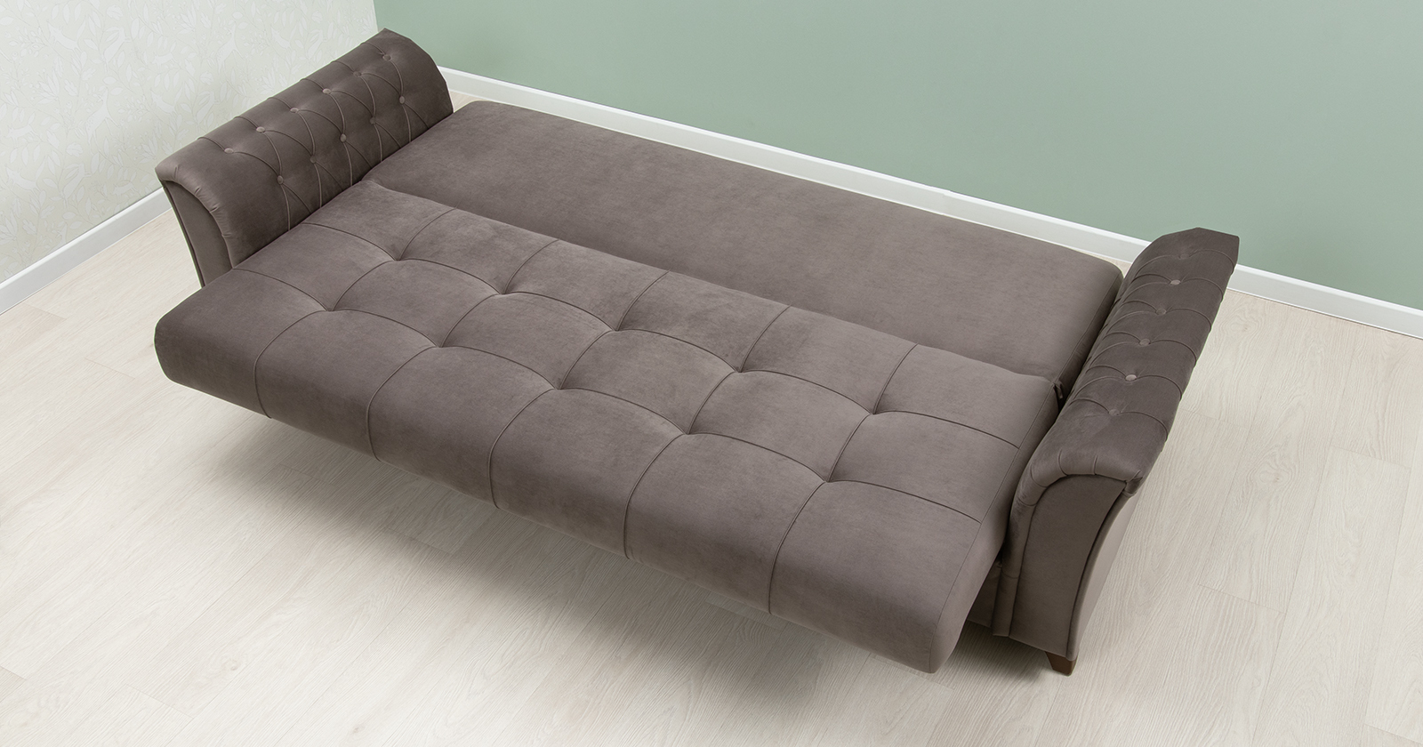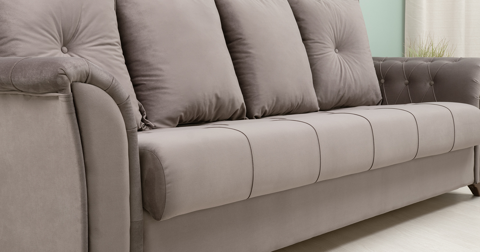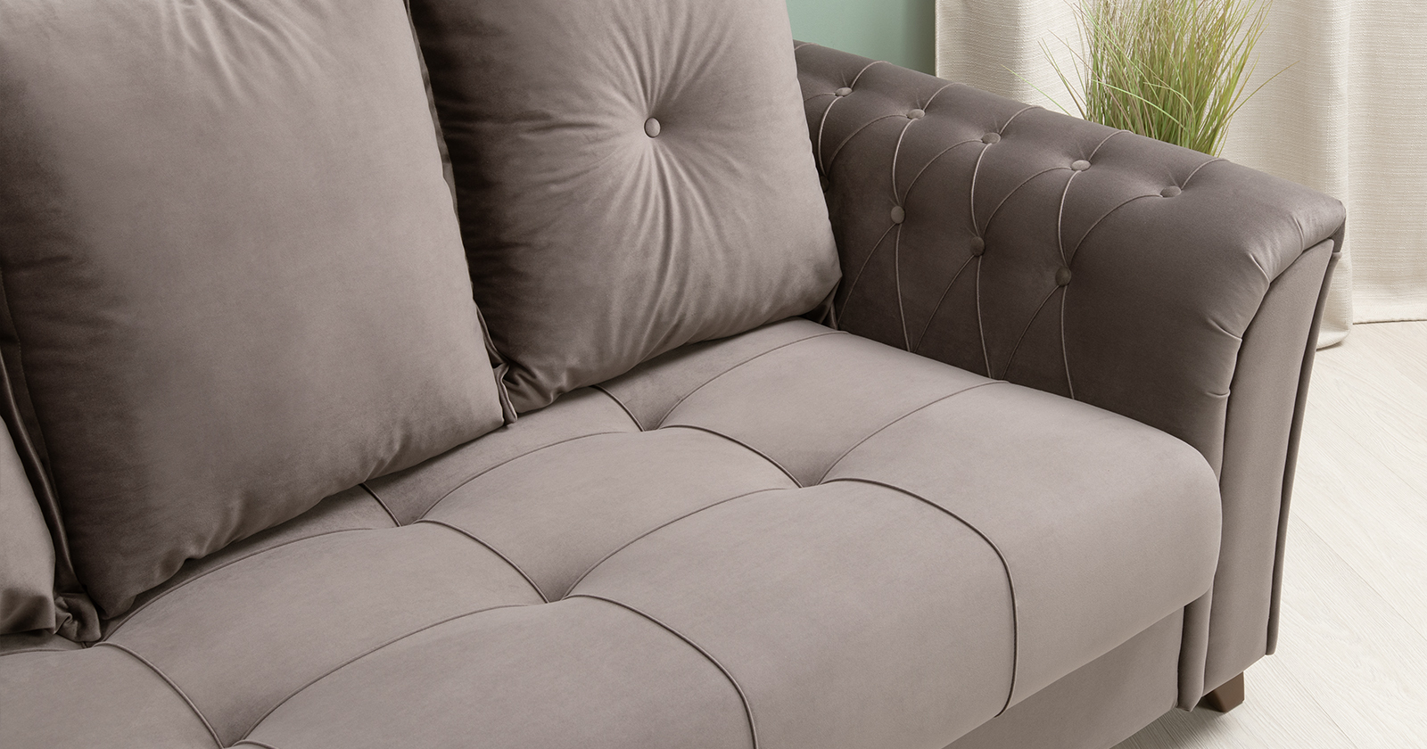 Обивка дивана-кровати выполнена из велюра Tenerife, состоящего из 100 % полиэстера. Велюр обладает объёмным густым ворсом, тактильной мягкостью и устойчивостью к зацепкам. Благодаря технологии бондинга Circle knitting волокна защищены от деформации, а устойчивость цвета к ультрафиолетовым лучам, сухому и мокрому трению гарантирует сохранение первоначального вида изделия на протяжении всего срока эксплуатации.