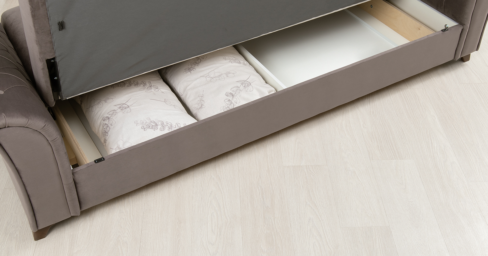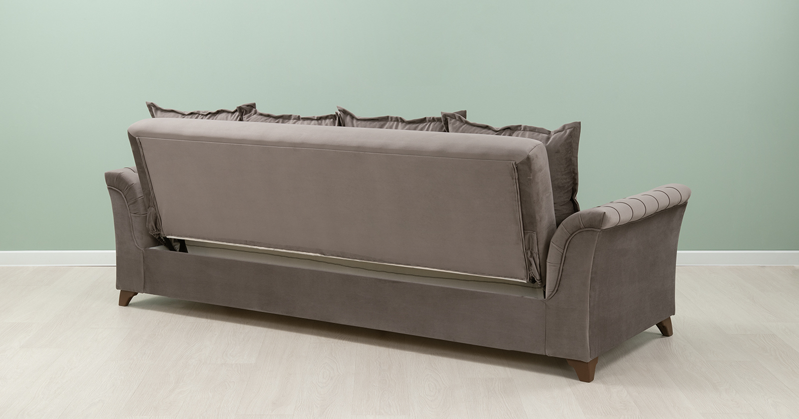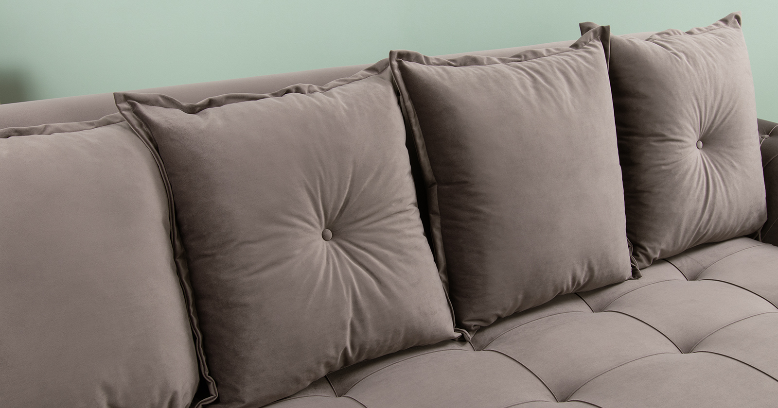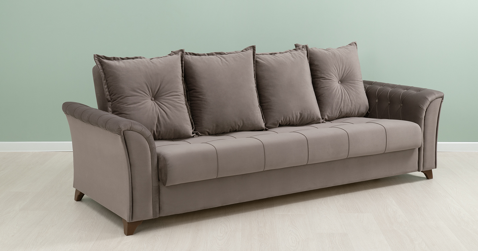 Обивка дивана-кровати выполнена из велюра Tenerife, состоящего из 100 % полиэстера. Велюр обладает объёмным густым ворсом, тактильной мягкостью и устойчивостью к зацепкам. Благодаря технологии бондинга Circle knitting волокна защищены от деформации, а устойчивость цвета к ультрафиолетовым лучам, сухому и мокрому трению гарантирует сохранение первоначального вида изделия на протяжении всего срока эксплуатации.