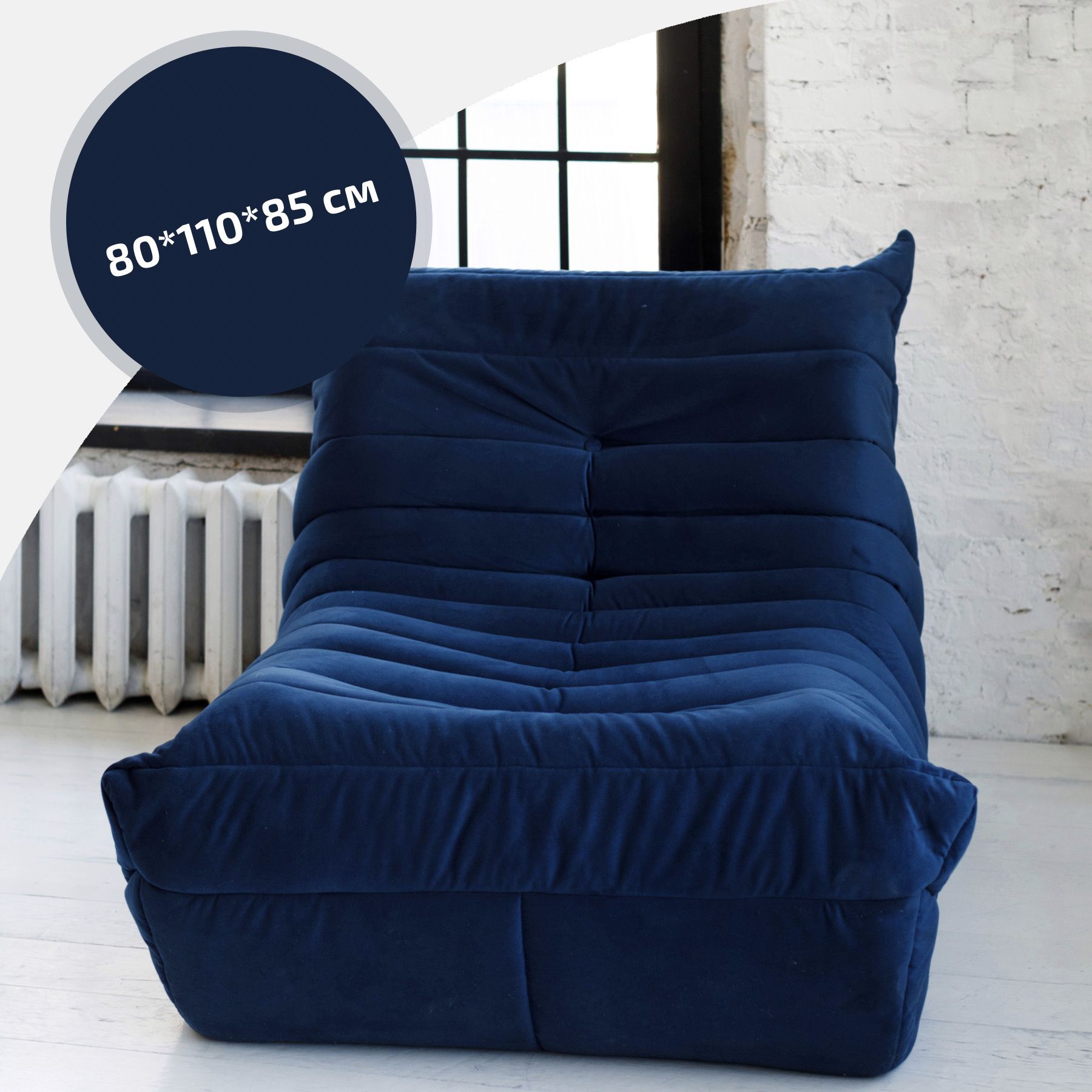 Размер модуля: глубина: 110 см ширина: 80 см высота: 85 см Высота сидушки – 40 см Глубина сидушки – 50 см. Материал обивки – велюр. Наполнение – ППУ. Диван модульный, модули соединяются друг с другом липучками. Таким образом вы можете подобрать размер дивана под вашу комнату. Благодаря отсутствию каркаса диван Маршмеллоу очень легкий, его без проблем можно передвинуть в другую комнату. Такой диван идеально впишется в гостиную или на веранду. Гарантия 12 месяцев распространяется на все наши изделия. Данная гарантия распространяется на внешний и внутренний чехол. Поставляется в прочных полиэтиленовых пакетах.