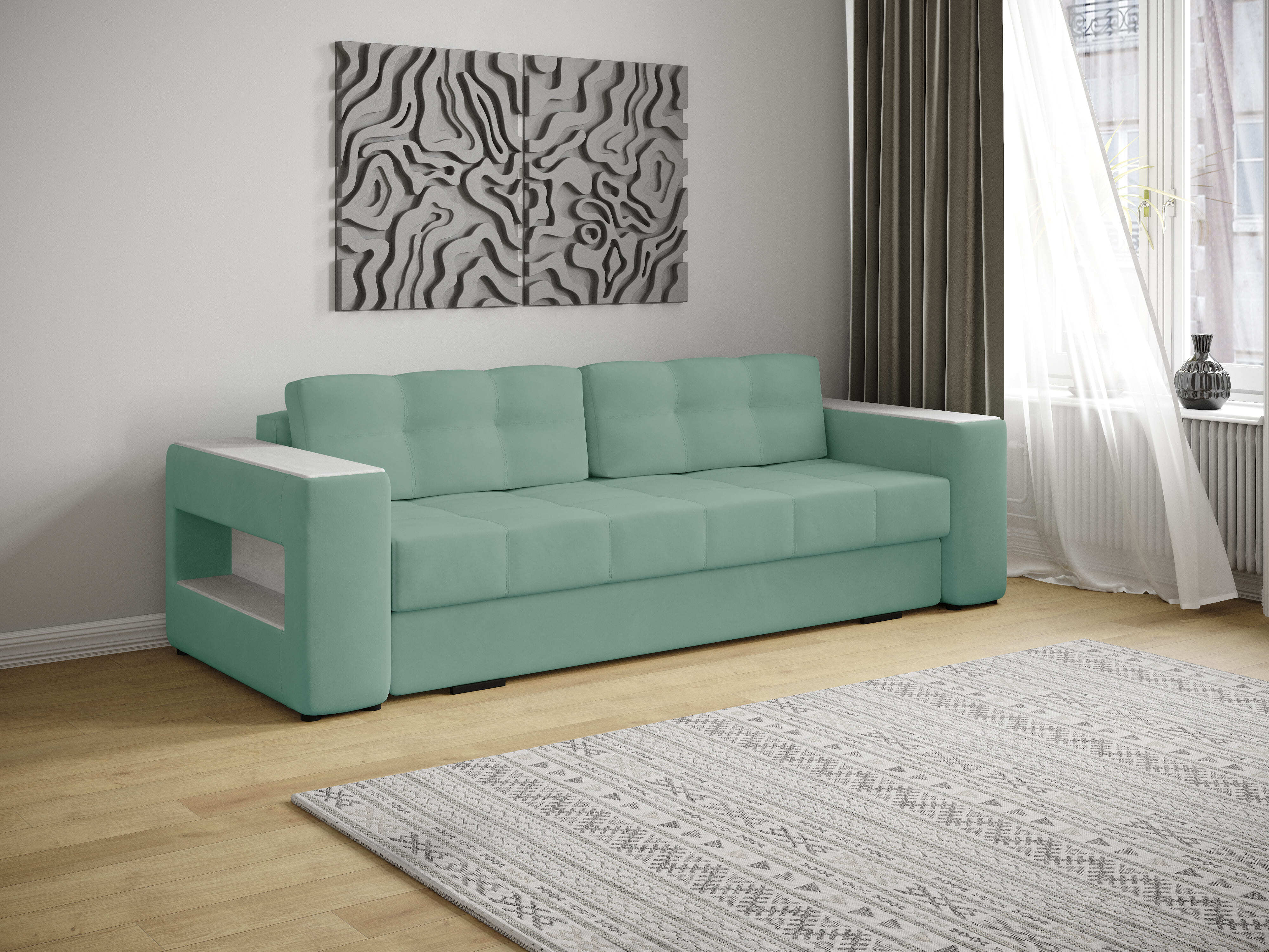 Диван-кровать Доро дополнит современный интерьер любой комнаты. Стильная модель на ножках. Он отлично разместится в гостиной, спальне, прихожей и даже кабинете. Диван идеально подходит для ежедневного использования как для отдыха, так и для полноценного сна. Он объединяет комфорт, функциональность и современный дизайн с элегантной отделкой подлокотников, что делает его отличным выбором для вашего интерьера.