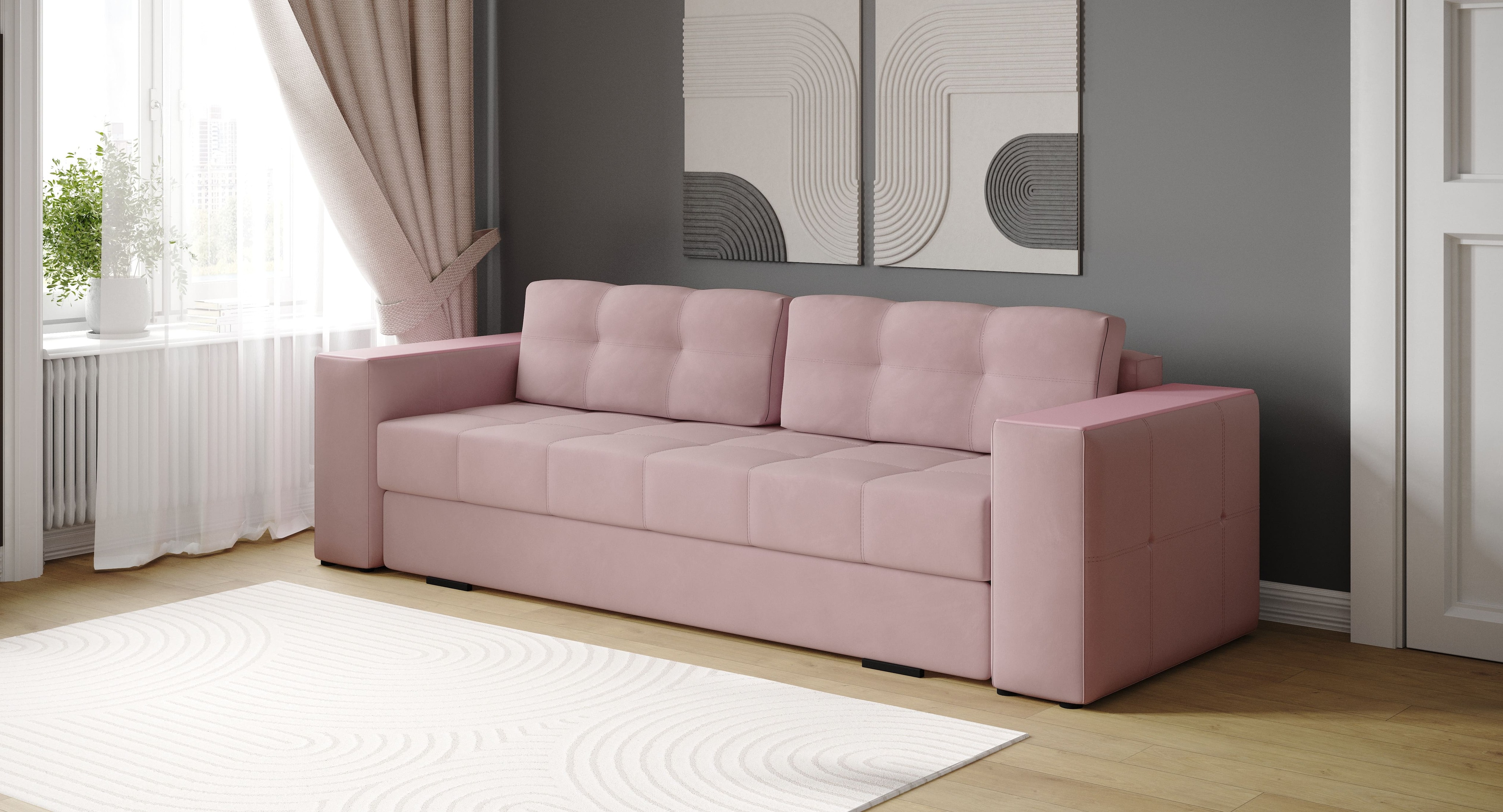 Диван-кровать Нави дополнит современный интерьер любой комнаты. Стильная модель на ножках. Он отлично разместится в гостиной, спальне, прихожей и даже кабинете. Диван идеально подходит для ежедневного использования как для отдыха, так и для полноценного сна. Он объединяет комфорт, функциональность и современный дизайн с элегантной отделкой подлокотников, что делает его отличным выбором для вашего интерьера.