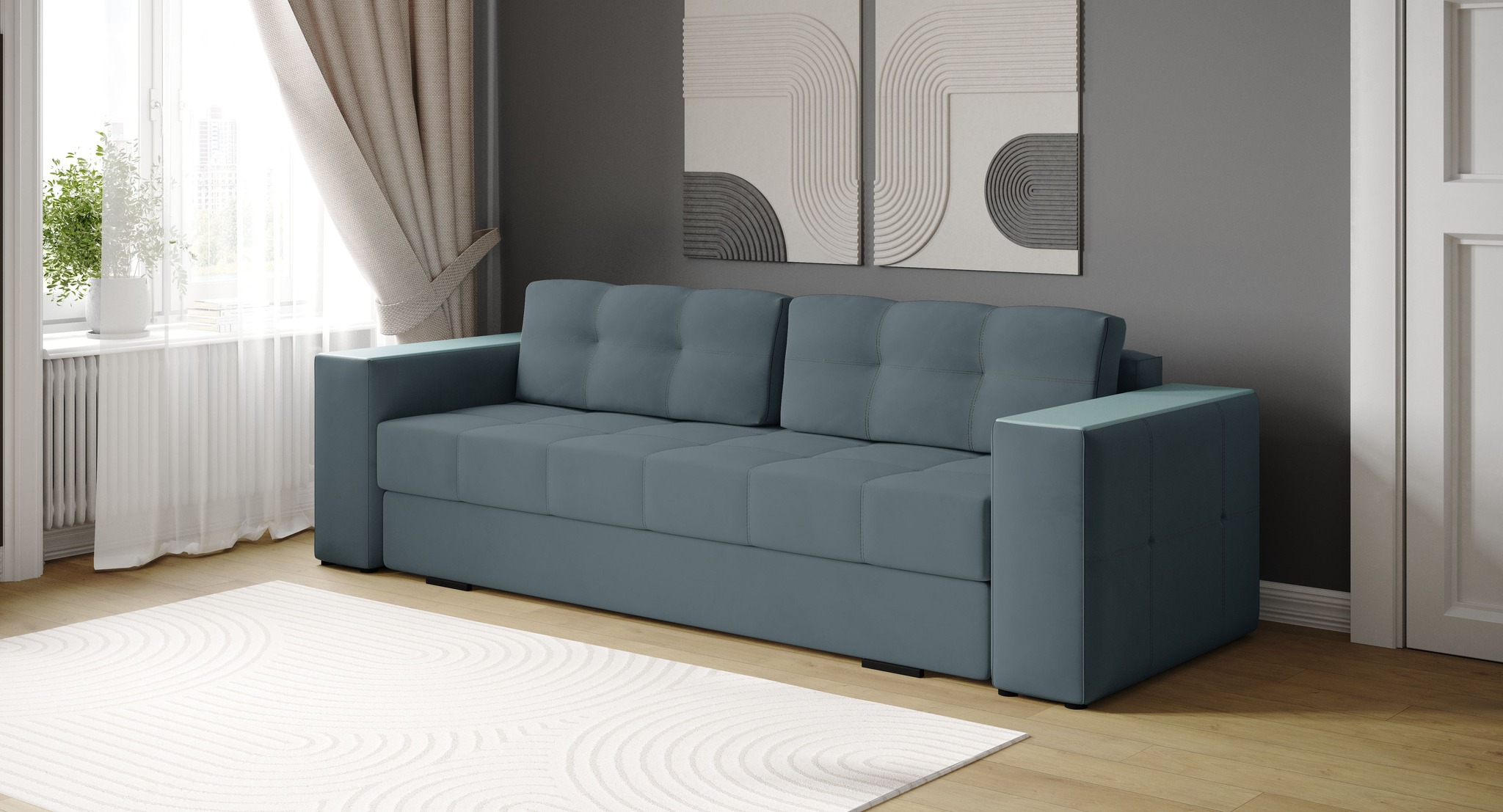 Диван-кровать Нави дополнит современный интерьер любой комнаты. Стильная модель на ножках. Он отлично разместится в гостиной, спальне, прихожей и даже кабинете. Диван идеально подходит для ежедневного использования как для отдыха, так и для полноценного сна. Он объединяет комфорт, функциональность и современный дизайн с элегантной отделкой подлокотников, что делает его отличным выбором для вашего интерьера.
