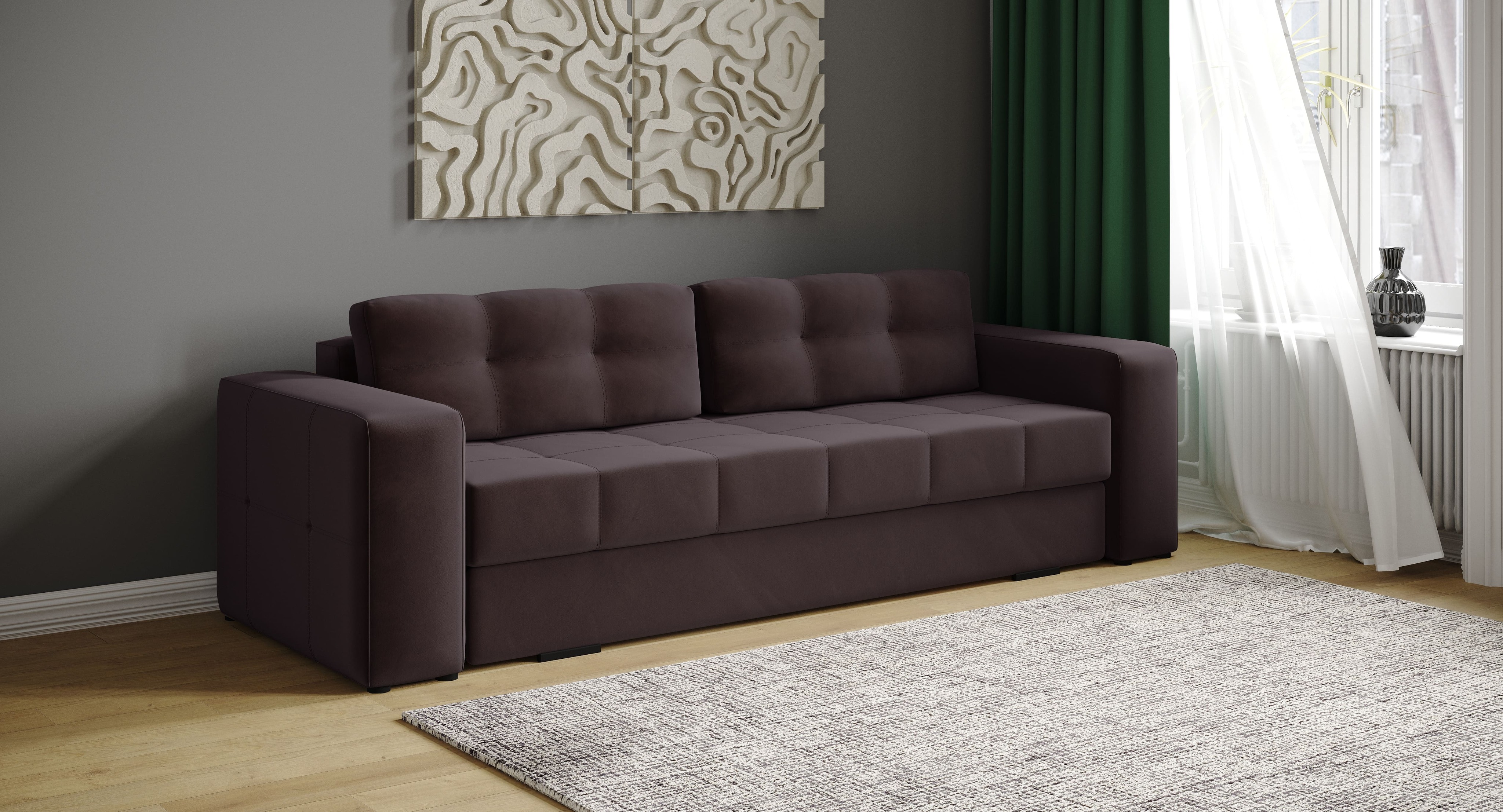 Диван раскладной Верден – это идеальное сочетание комфорта и стиля. Обивка из мягкого и приятного на ощупь велюра придаёт ему элегантный вид, а также обеспечивает тепло и уют в любое время года. Диван легко трансформируется в просторное спальное место, что делает его отличным вариантом для гостиных или студий.