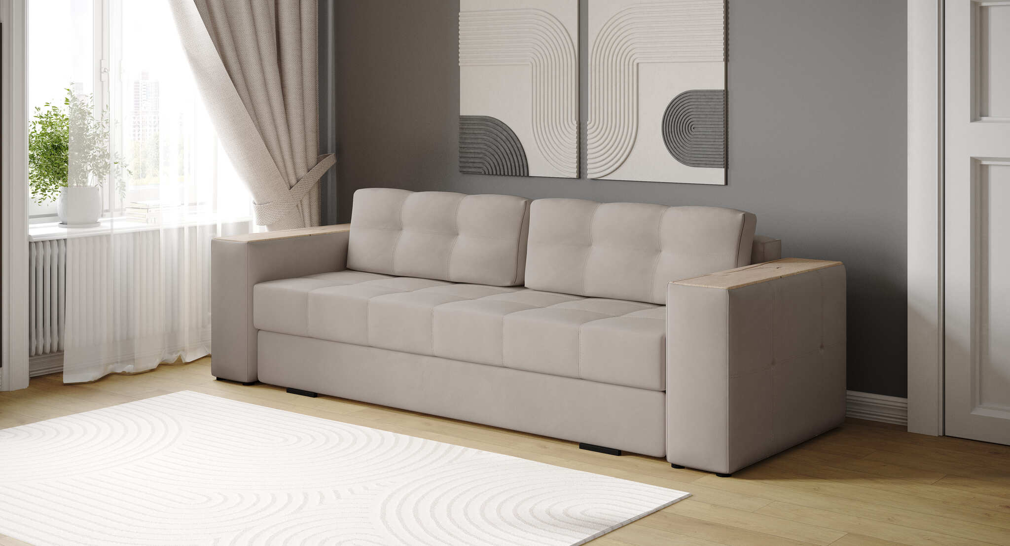 Диван-кровать «Виконт» дополнит современный интерьер любой комнаты. Стильная модель на ножках. Он отлично разместится в гостиной, спальне, прихожей и даже кабинете. Диван идеально подходит для ежедневного использования как для отдыха, так и для полноценного сна. Он объединяет комфорт, функциональность и современный дизайн с элегантной отделкой подлокотников, что делает его отличным выбором для вашего интерьера.