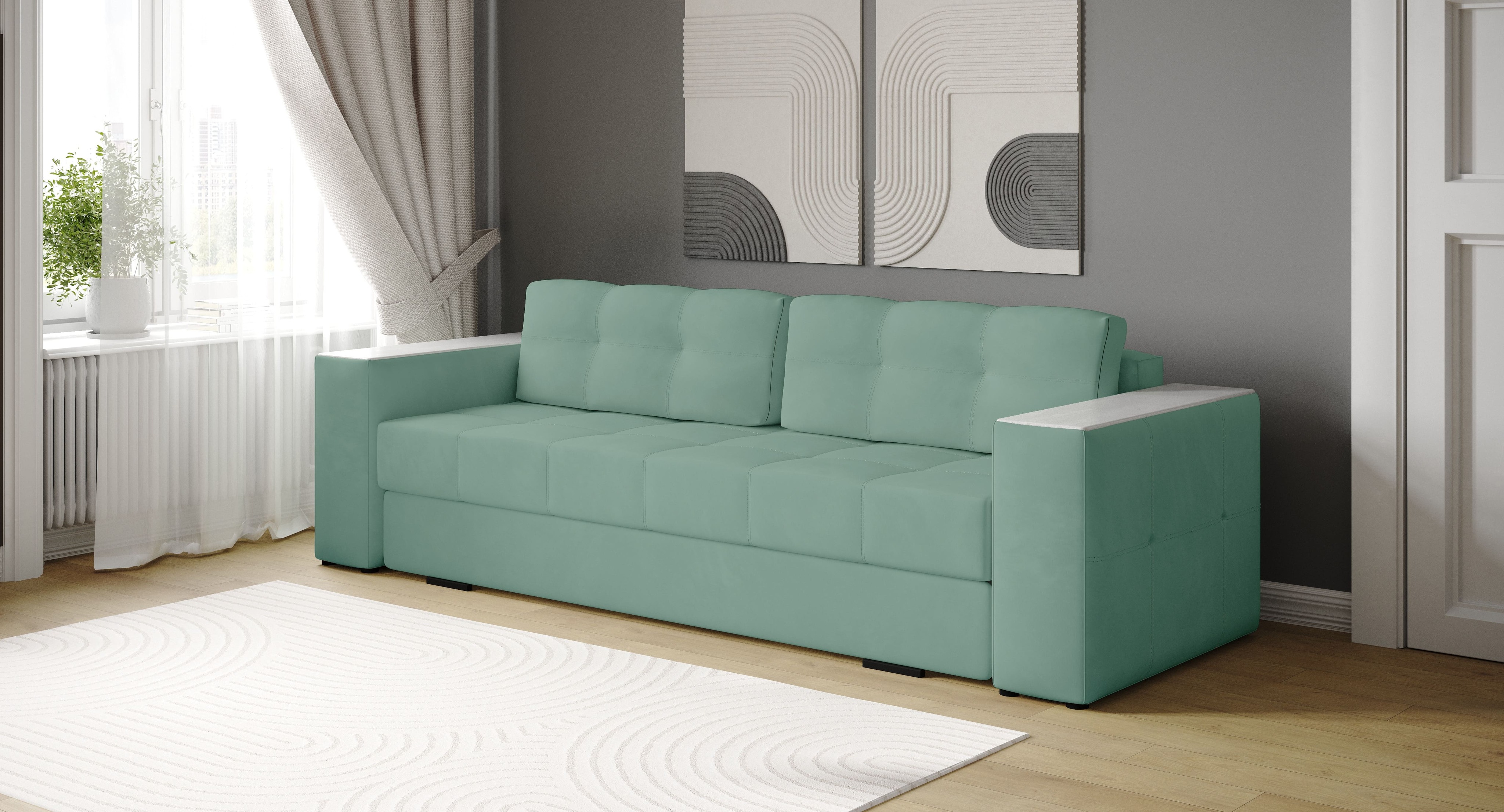 Диван-кровать «Виконт» дополнит современный интерьер любой комнаты. Стильная модель на ножках. Он отлично разместится в гостиной, спальне, прихожей и даже кабинете. Диван идеально подходит для ежедневного использования как для отдыха, так и для полноценного сна. Он объединяет комфорт, функциональность и современный дизайн с элегантной отделкой подлокотников, что делает его отличным выбором для вашего интерьера.