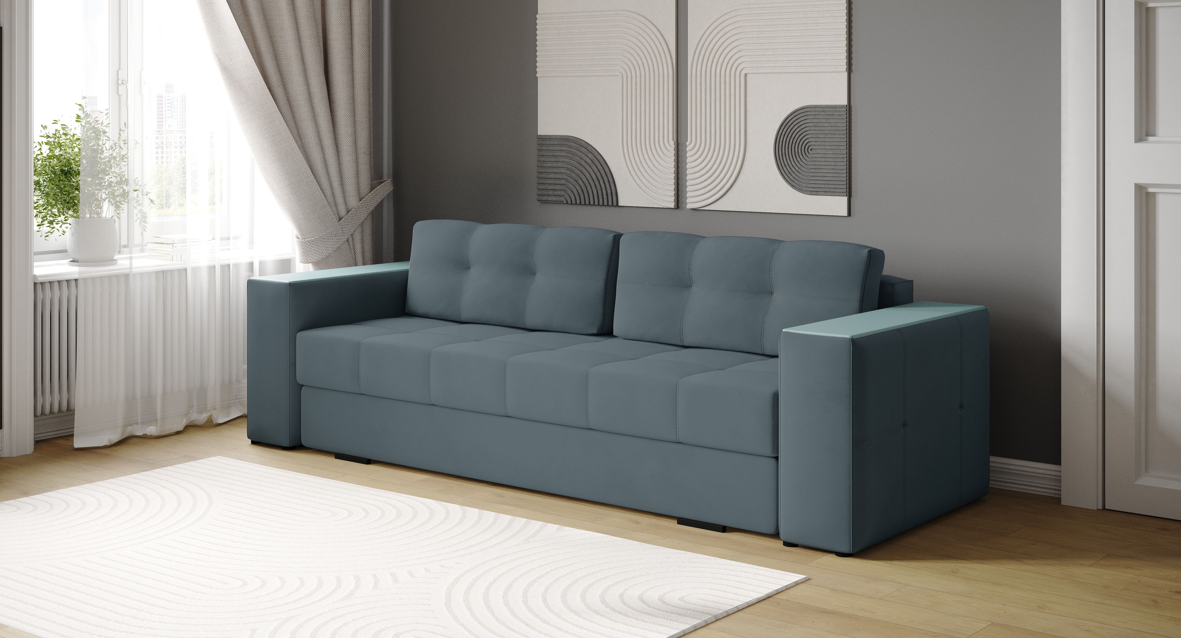Диван-кровать «Виконт» дополнит современный интерьер любой комнаты. Стильная модель на ножках. Он отлично разместится в гостиной, спальне, прихожей и даже кабинете. Диван идеально подходит для ежедневного использования как для отдыха, так и для полноценного сна. Он объединяет комфорт, функциональность и современный дизайн с элегантной отделкой подлокотников, что делает его отличным выбором для вашего интерьера.