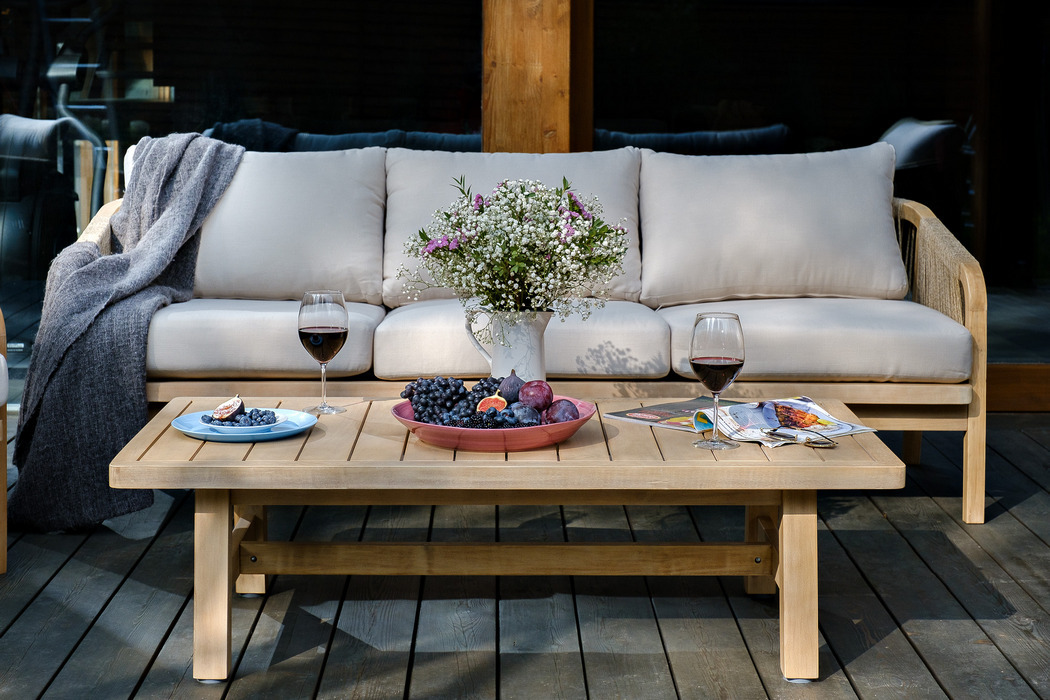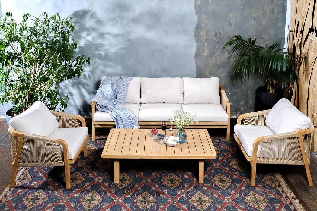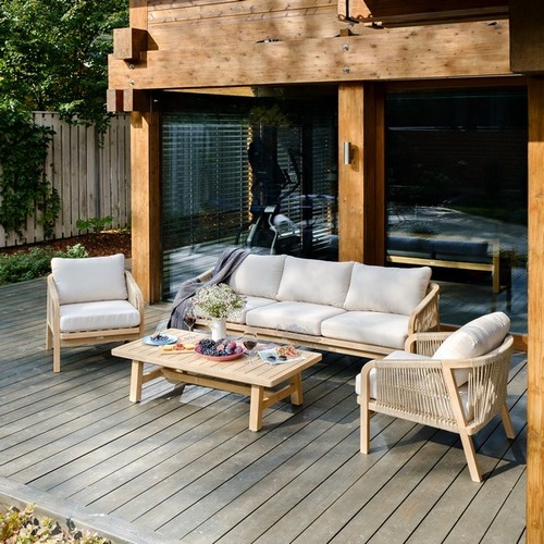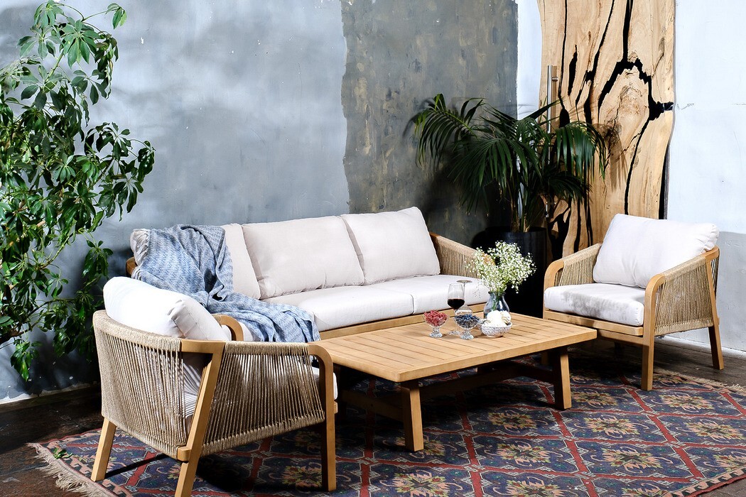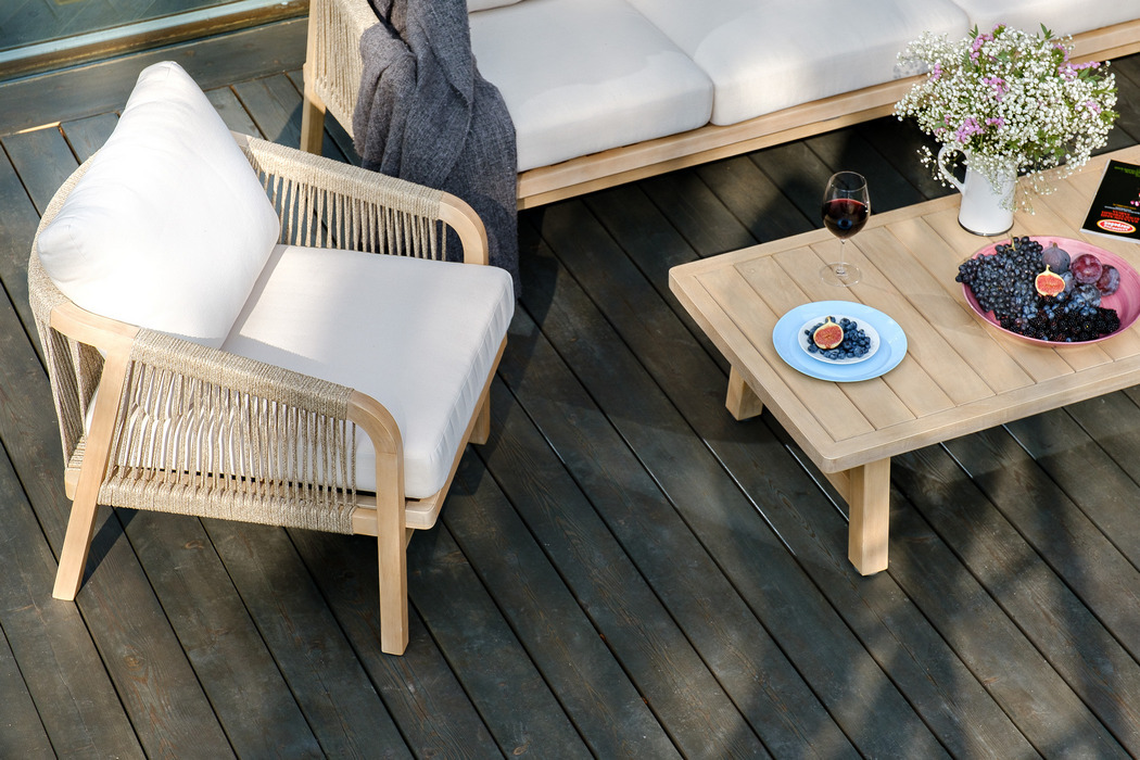 РИМИНИ – современная коллекция садовой мебели из акации, выполненная в комбинации натурального веревочного плетения rope, массива акации и бежевых подушек.