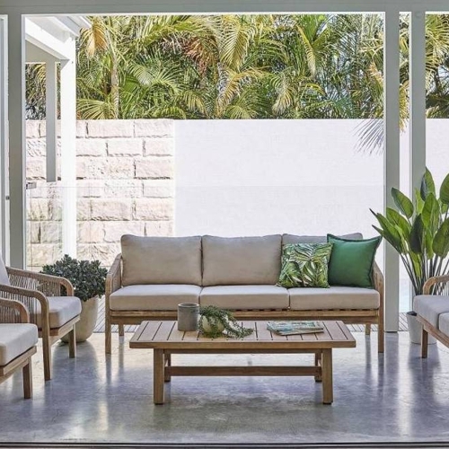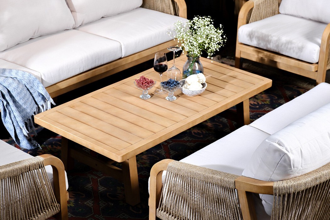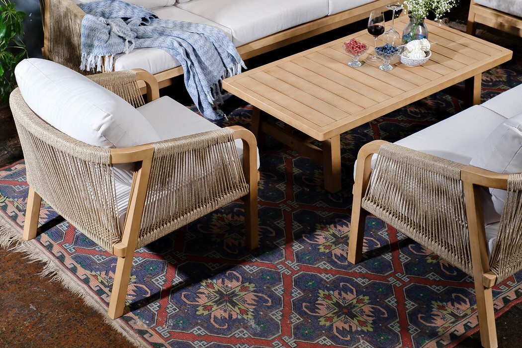 РИМИНИ – современная коллекция садовой мебели из акации, выполненная в комбинации натурального веревочного плетения rope, массива акации и бежевых подушек.