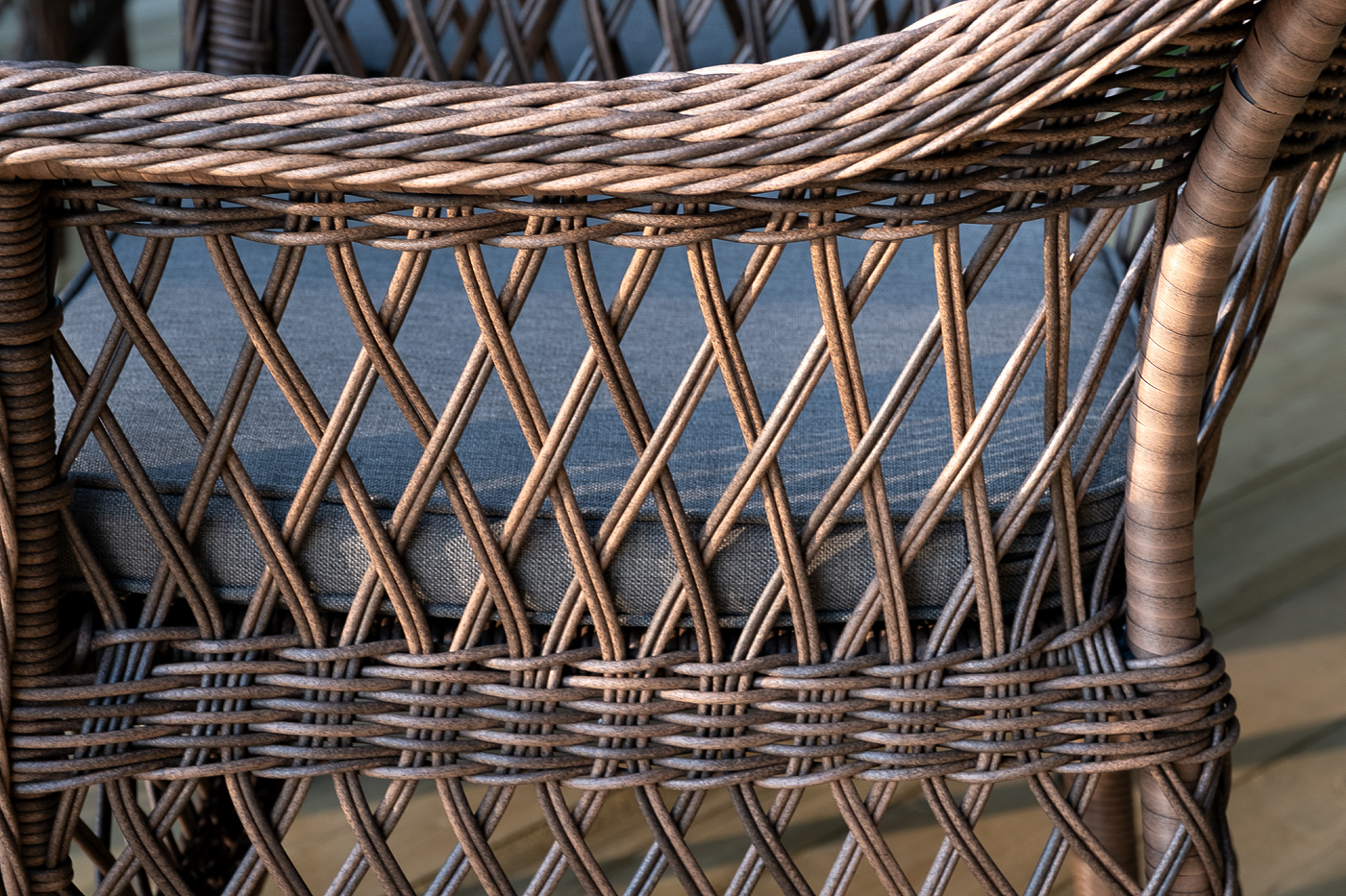 Из алюминия выполнен устойчивый каркас мебели, который задекорирован искусственным ротангом круглого ручного плетения. Комплект представлен в коричневом цвете.