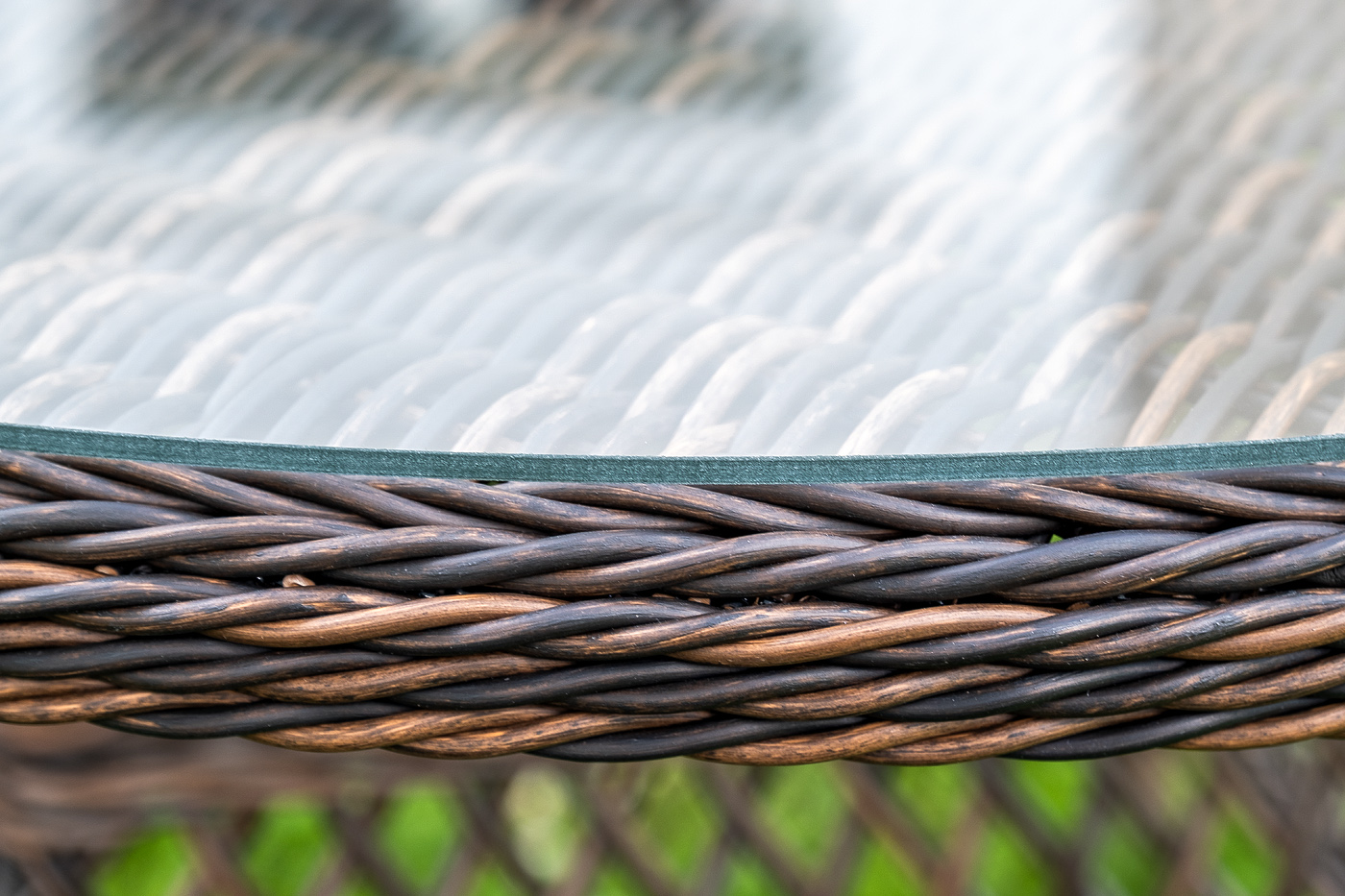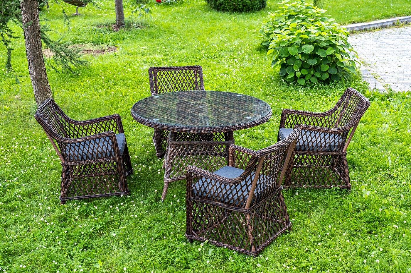 Классическая уличная обеденная группа «Доппио» для сада, летней веранды ресторана. В комплекте круглый обеденный стол «Эспрессо» (1180×1180×750 мм) с ударопрочной стеклянной столешницей и 4 кресла коллекции «Латте» 550×660×850 мм.