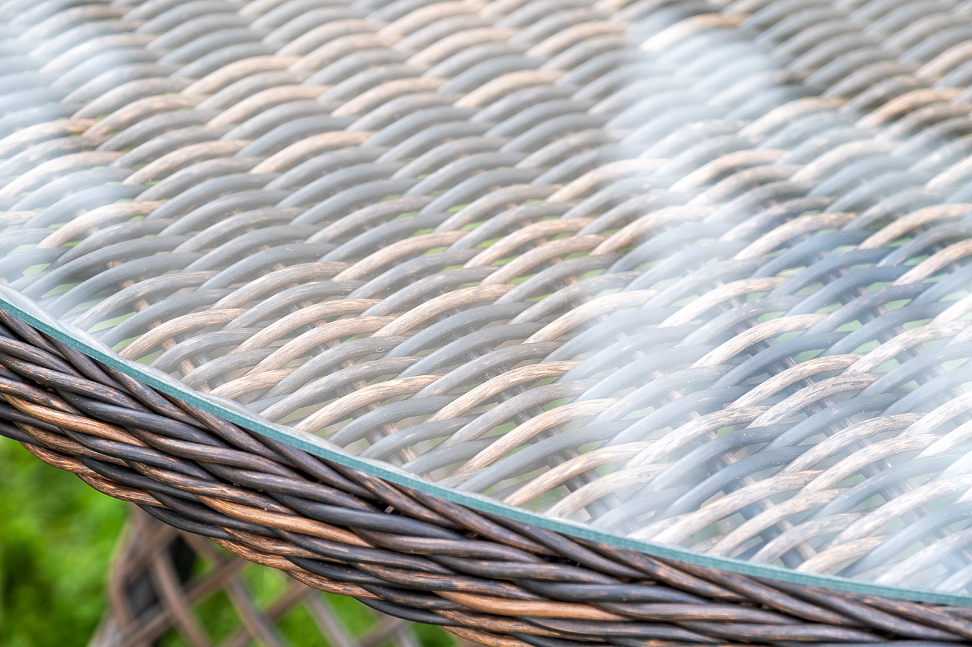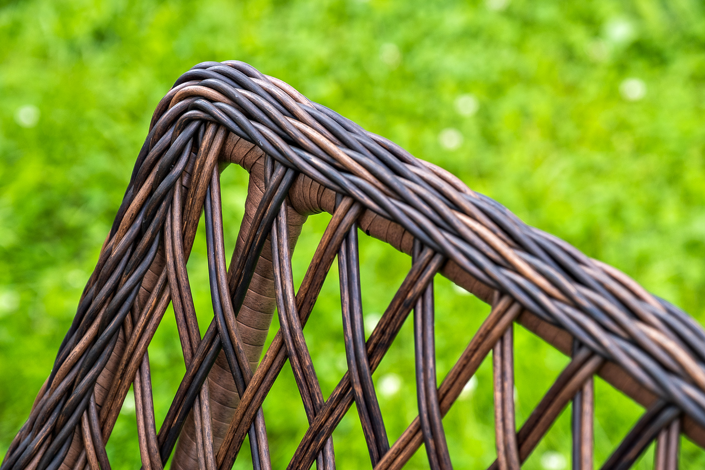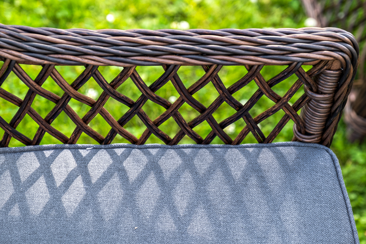 Каркас мебели выполнен из прочного и легкого алюминия, вручную оплетенного круглым синтетическим ротангом натурального коричневого оттенка. На креслах предусмотрены мягкие подушки со съёмными чехлами серого цвета.