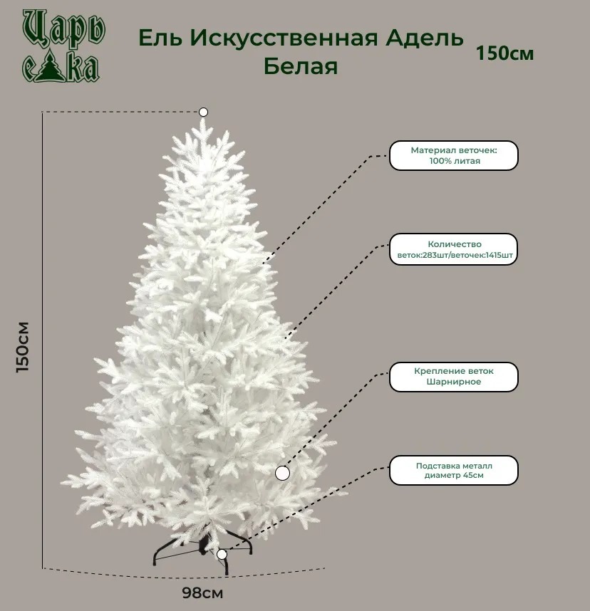 Елка новогодняя искусственная Адель белая 150 см. Литая елка прослужит Вам очень долго и Вы можете быть уверенными , что хвоя не помнется, ведь веточки быстро расправляются и восстанавливают форму после сезонного хранения, а значит внешний вид елки ничуть не испортится. Сборка такой елки проста, Вам нужно только достать елку из коробки, соединить между собой части ствола, отогнуть ветки от ствола и расправить их для придания естественного вида. Ствол ели и ветви задекорированы хвоей из материала - пленка ПВХ. Технология декорирования пленкой ПВХ металлических частей ствола и веток применяется во всех елках премиум исполнения. Также для новогоднего и праздничного образа отлично подойдут : звезда на елку, елочная игрушка, шары для елки, искусственные цветы, ветки, бусы, также корзина для елки отлично задекорирует вашу подставку новогодней елки. Вы можете использовать любые украшения и игрушки, такая елка подарит новогоднее волшебство даже если на ней будет одна гирлянда, да и вовсе без украшений данная ель подарит Вам чудесную атмосферу праздника. Ее необычный цвет точно не оставит Ваших гостей равнодушными, такая красавица будет радовать взор каждого. Ваша новая елка порадует Вас и Ваших родных и близких!