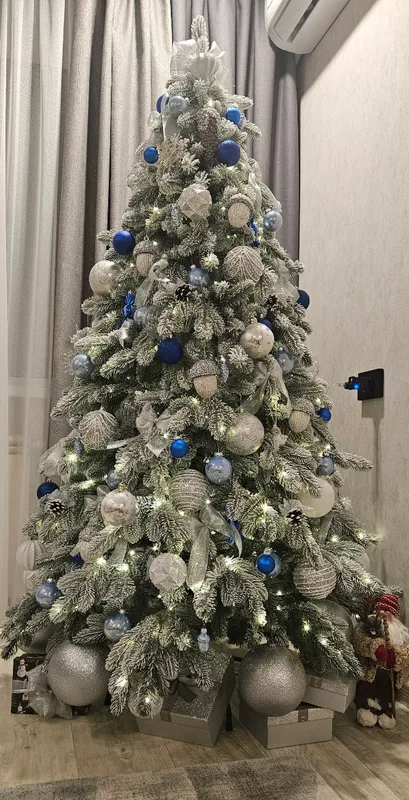Ель "Афродита" имеет высоту 180 см и состоит из трех ярусов, что придает ей пышный и объемный вид. Диаметр основания составляет 100 см, а количество ветвей - 307 штук. Крепление веток выполнено на шарнирах, что обеспечивает их гибкость и естественность.