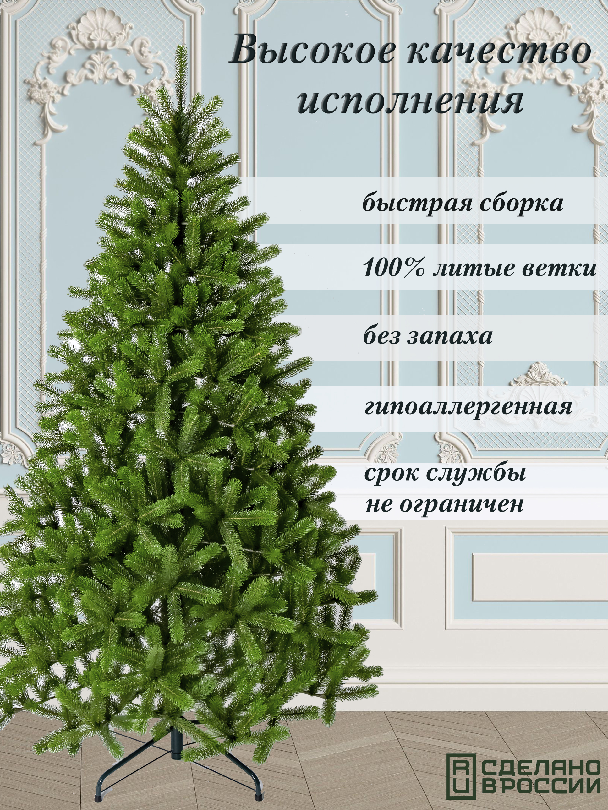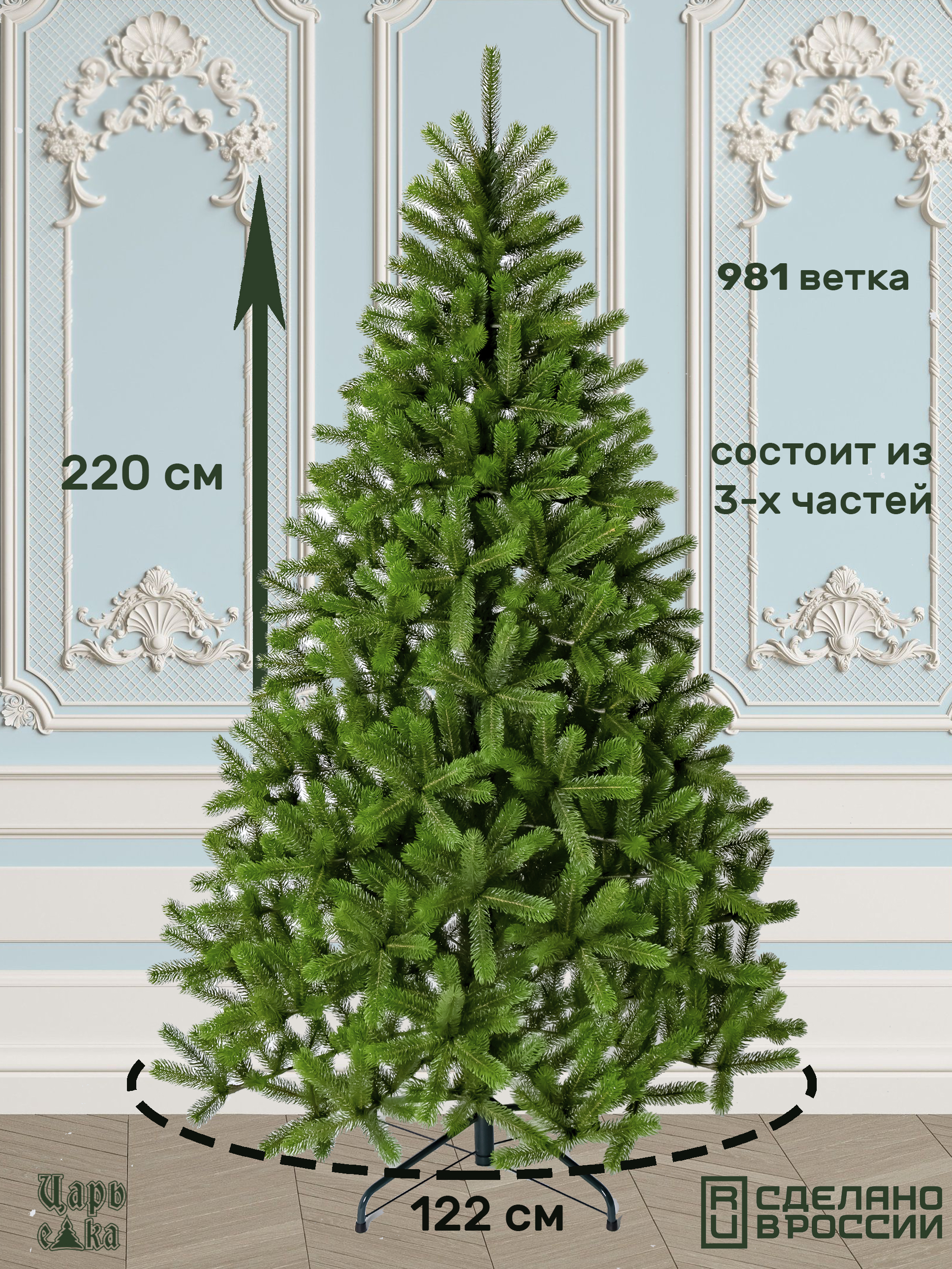 Конструкция этой елки ствольная, что обеспечивает ей устойчивость и надежность. Количество ветвей составляет 981, что придает дереву пышность и объем.
