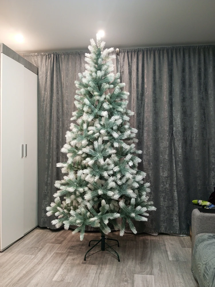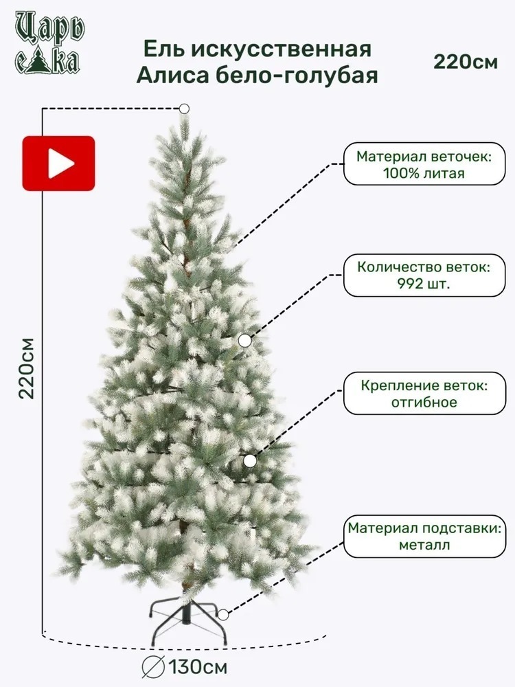 Искусственная ель "Алиса бело голубая" имеет высоту 220 см, что делает ее заметной и привлекательной. Диаметр основания составляет 130 см, что позволяет разместить ее в просторном помещении.