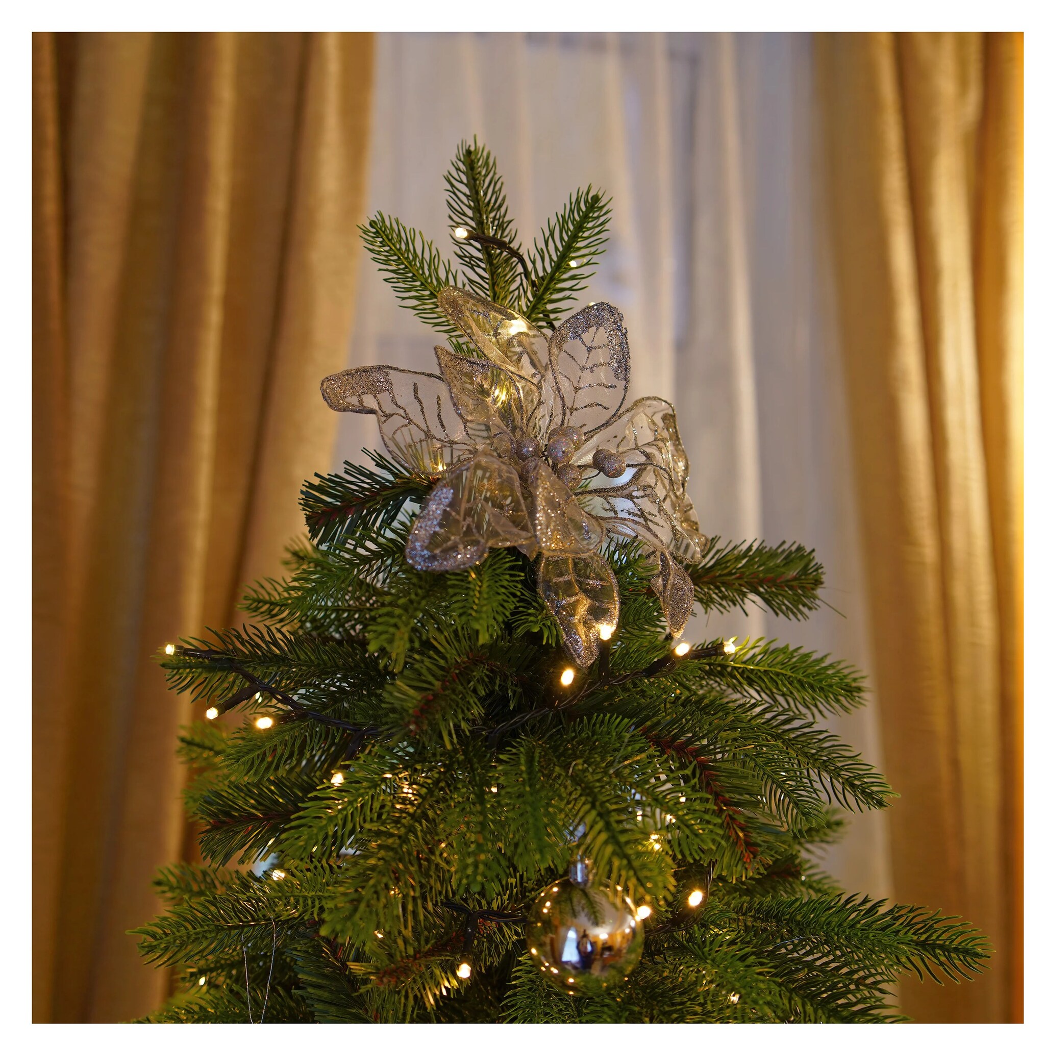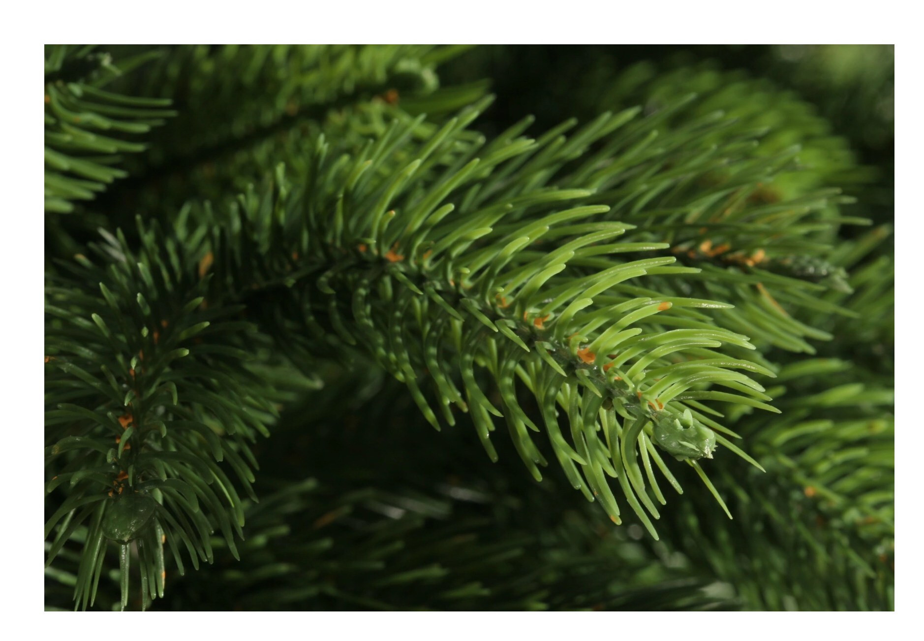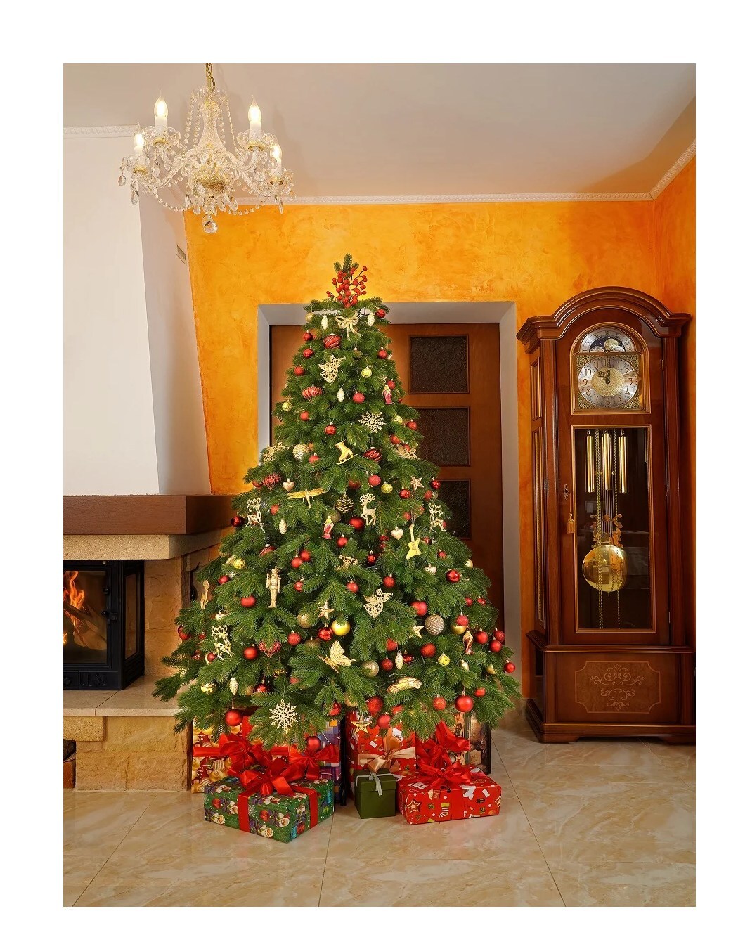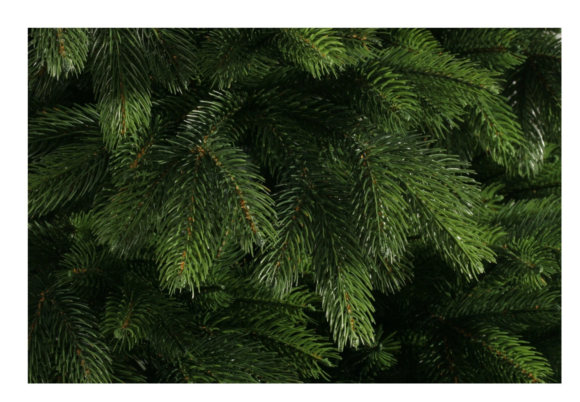 Ель оснащена 1289 ветвями, которые крепятся на шарнирах. Это позволяет легко менять положение веток и придавать им любую форму. Материал хвои - литая ПЭ, что обеспечивает реалистичный вид и долговечность.