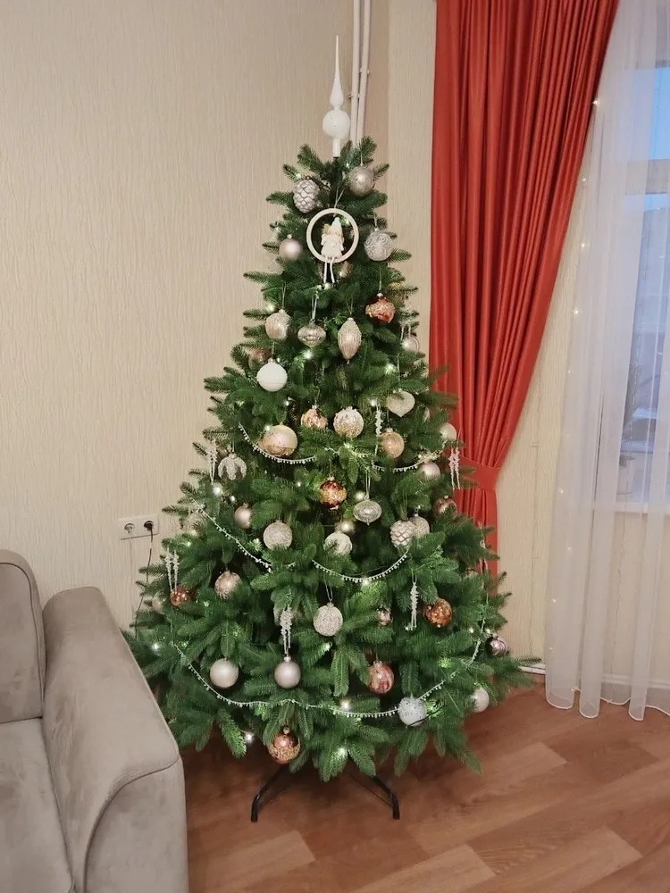 Елка имеет высоту 210 см и диаметр основания 140 см, что делает ее достаточно заметной и в то же время компактной. Конструкция ствольная, что обеспечивает устойчивость и надежность.