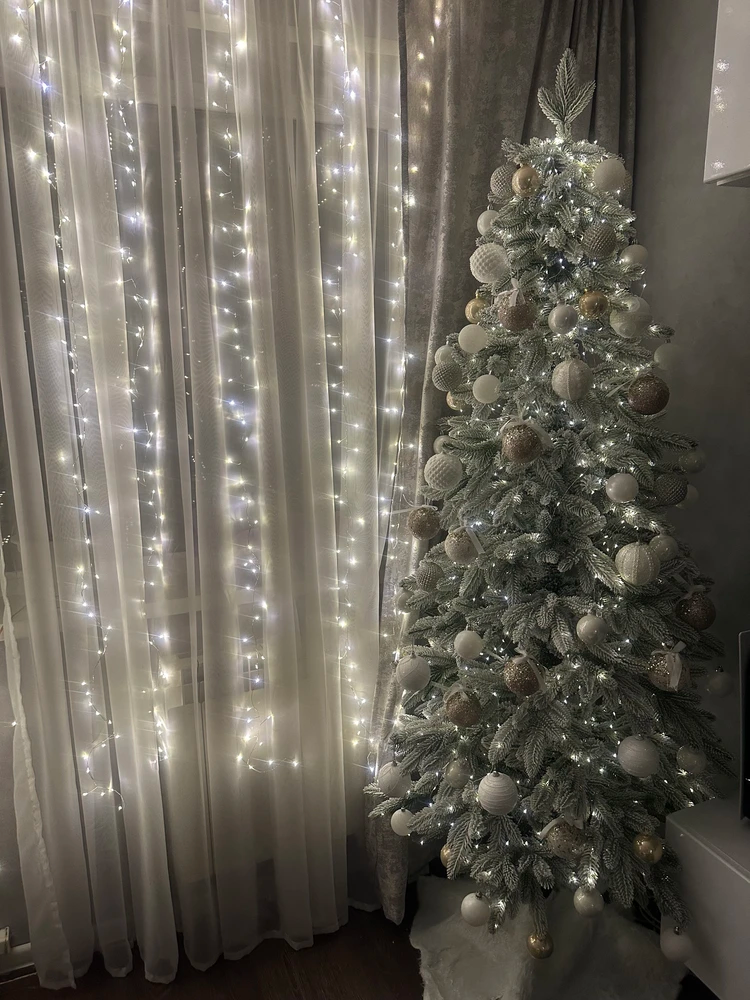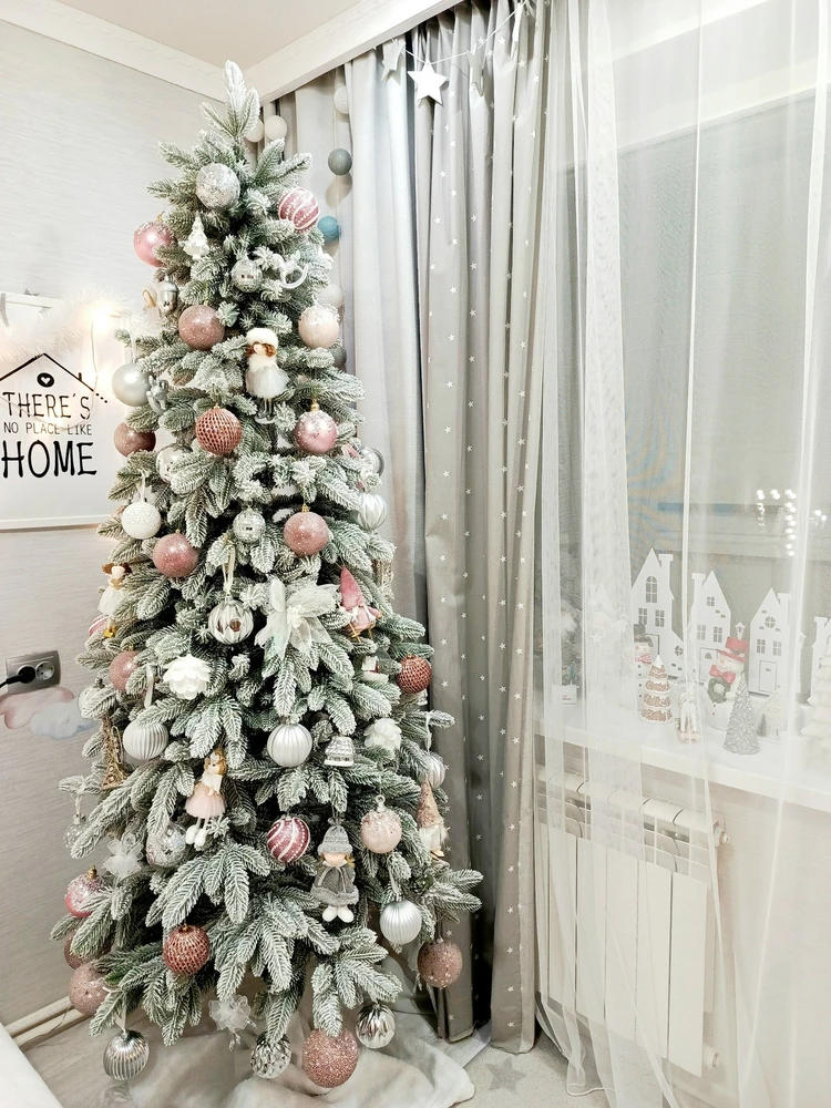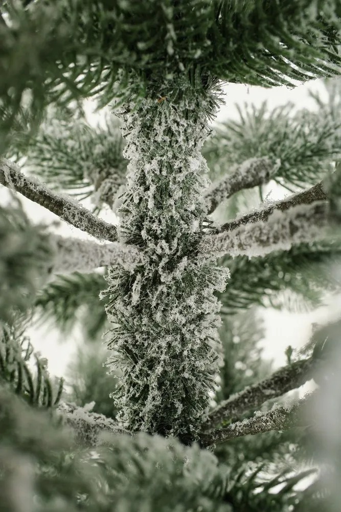 Заснеженный декор придает елке реалистичный и праздничный вид. Цвет хвои – зеленый, что создает уютную и теплую атмосферу в доме.