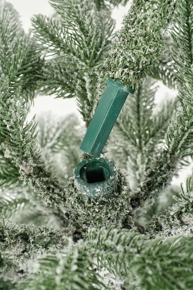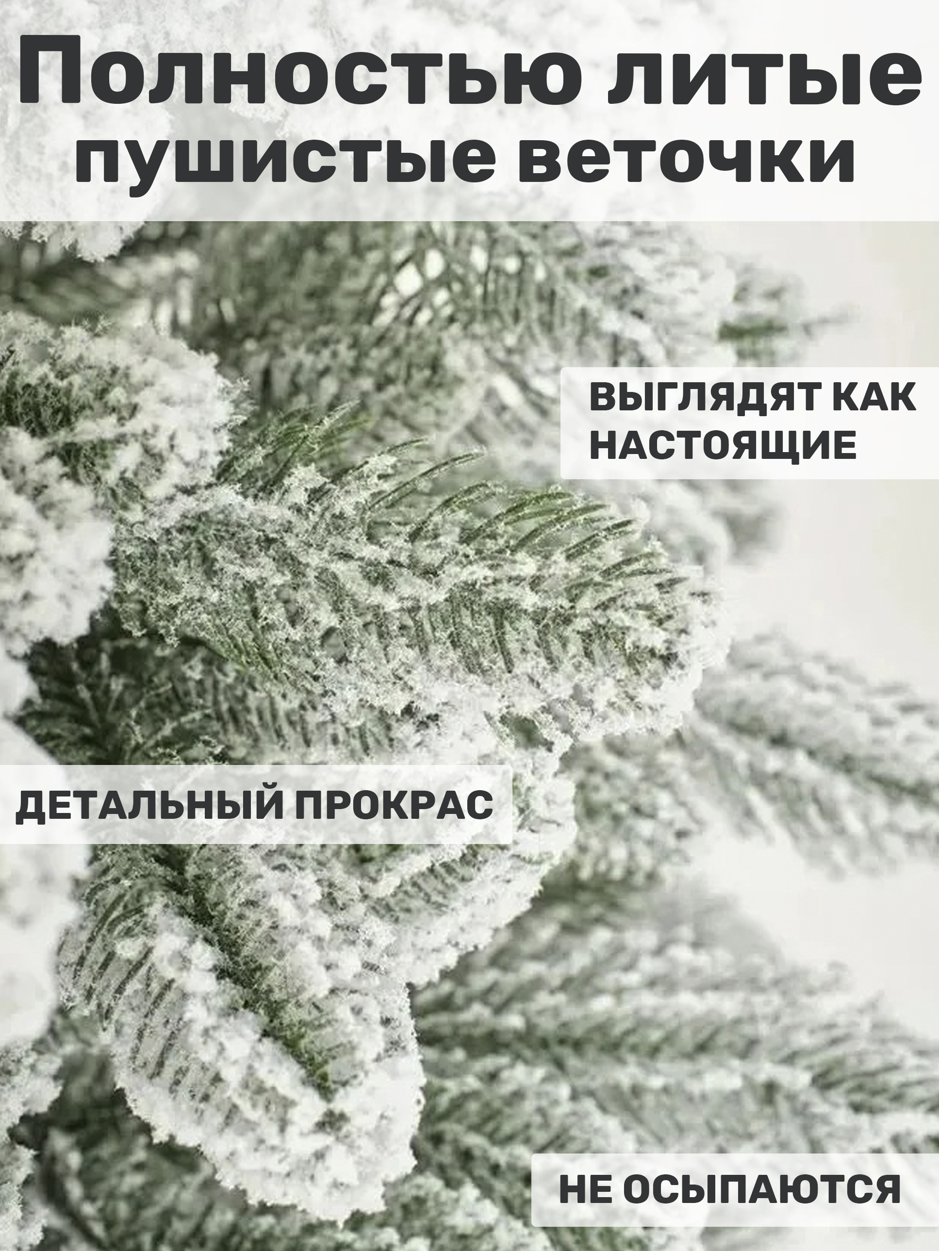 Материал хвои - 100% литая ПЭ, что гарантирует реалистичность и пушистость веток. Крепление веток осуществляется на шарнирах, что позволяет легко и быстро собирать и разбирать елку.
