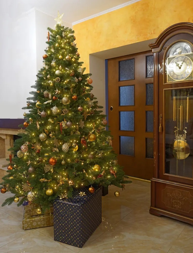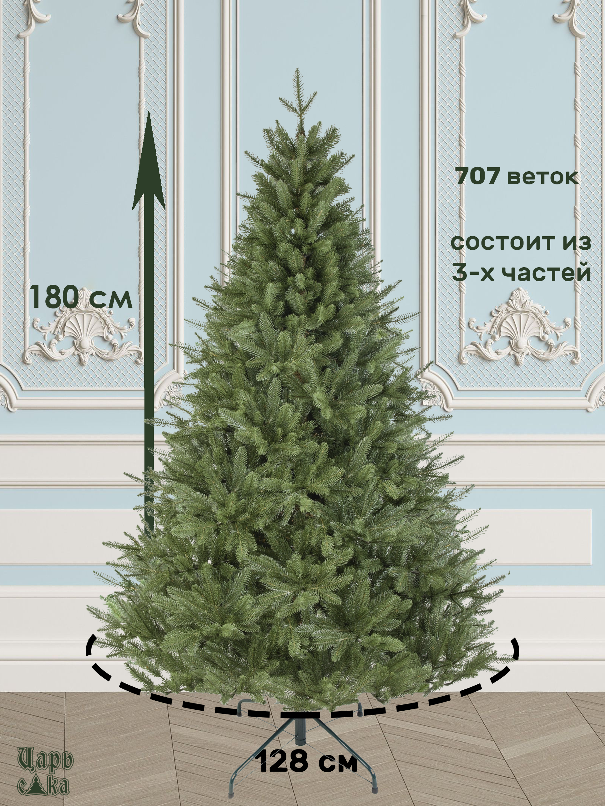 Елка имеет высоту 180 см и диаметр основания 128 см. Количество ветвей составляет 707 штук, что обеспечивает пышность и объемность дерева.